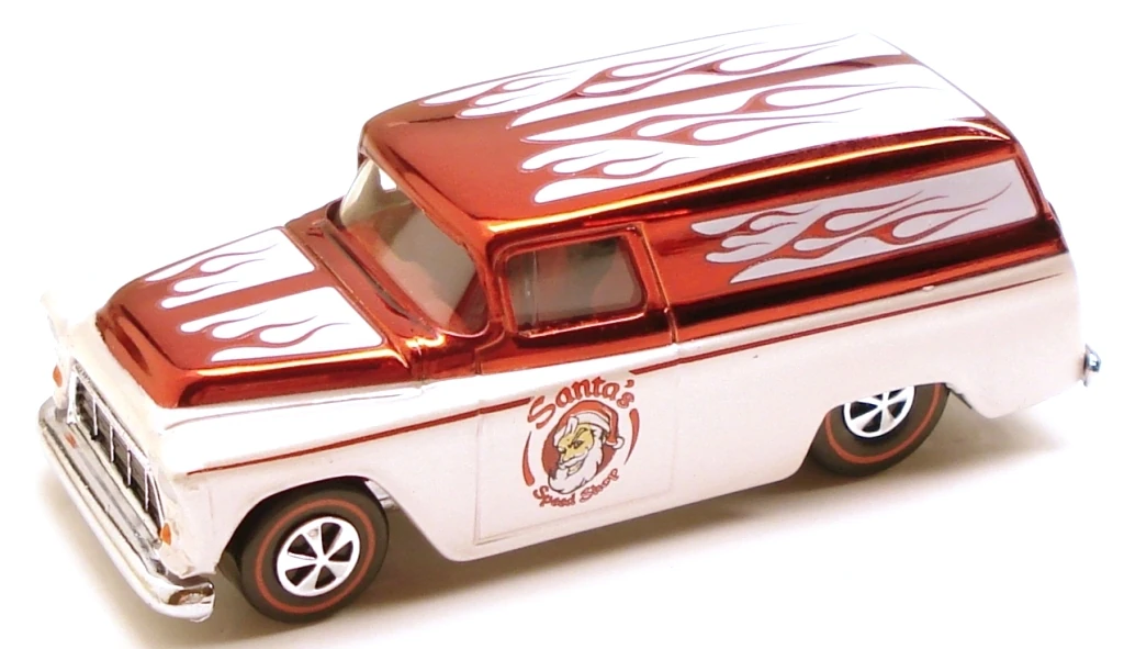 | '55 Chevy | Spectraflame Red and Pearl White | White reverse flames. Red "Santa's speed shop" | Chrome / Metal |
