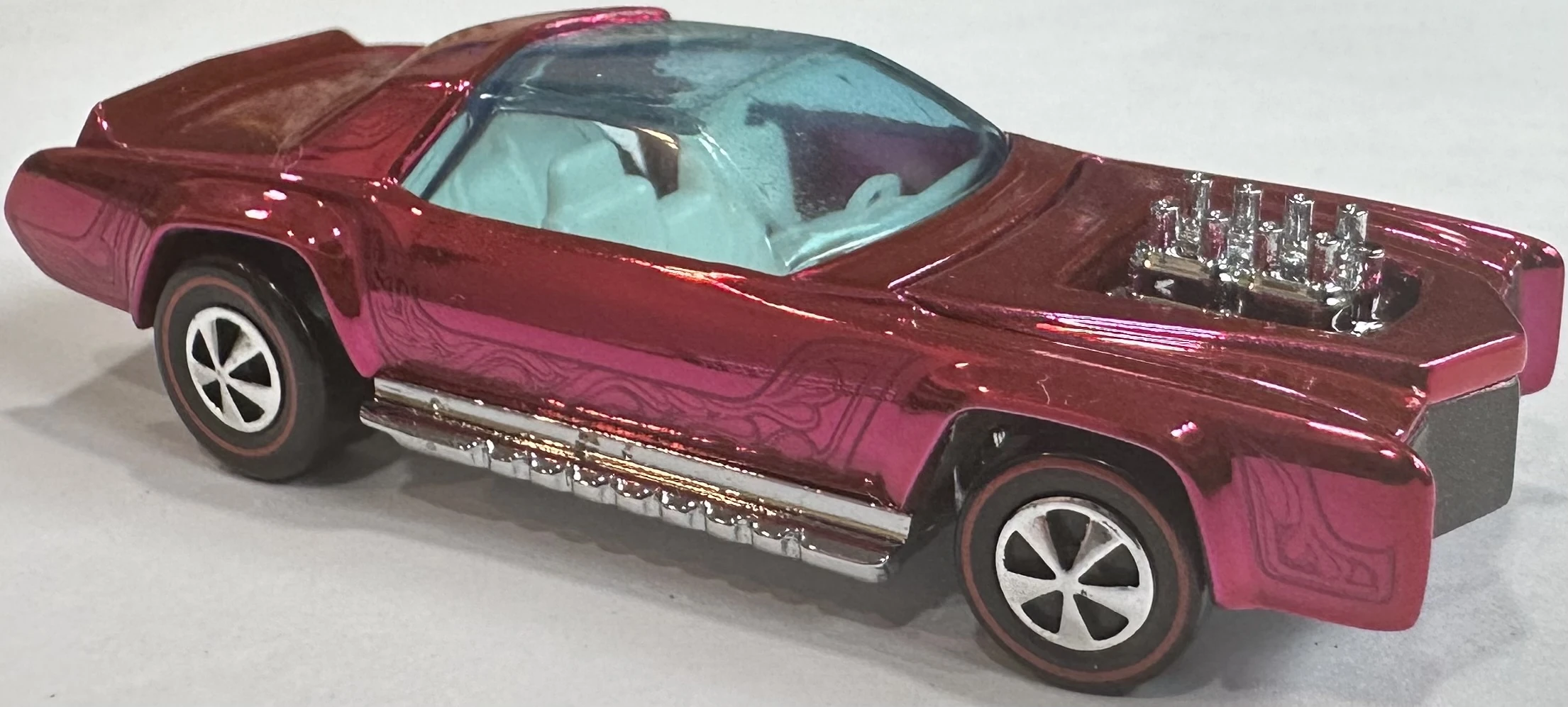 | Haul of Flame | White and Spectraflame Blue | Flame tampos on sides and roof, w/"Hot Wheels" and "Mattel" logo | Chrome / Metal |