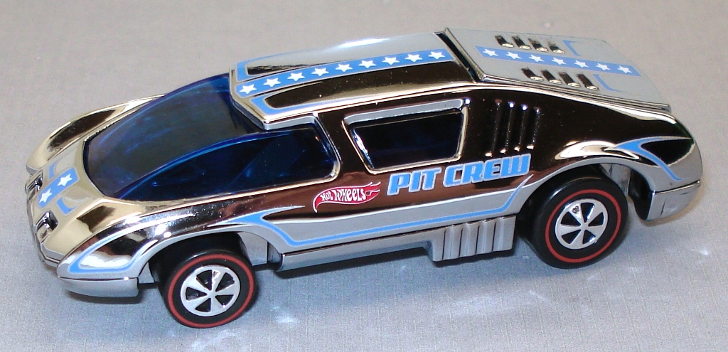 | 6 | Pit Crew Car | Chrome | Blue & Silver Graphics, "PIT CREW", Stars, Red & White Hot Wheels logo | Chrome-Plated Metal | Dark Blue Tint | Black | RL | China | September 29, 2009 | 7,500 |