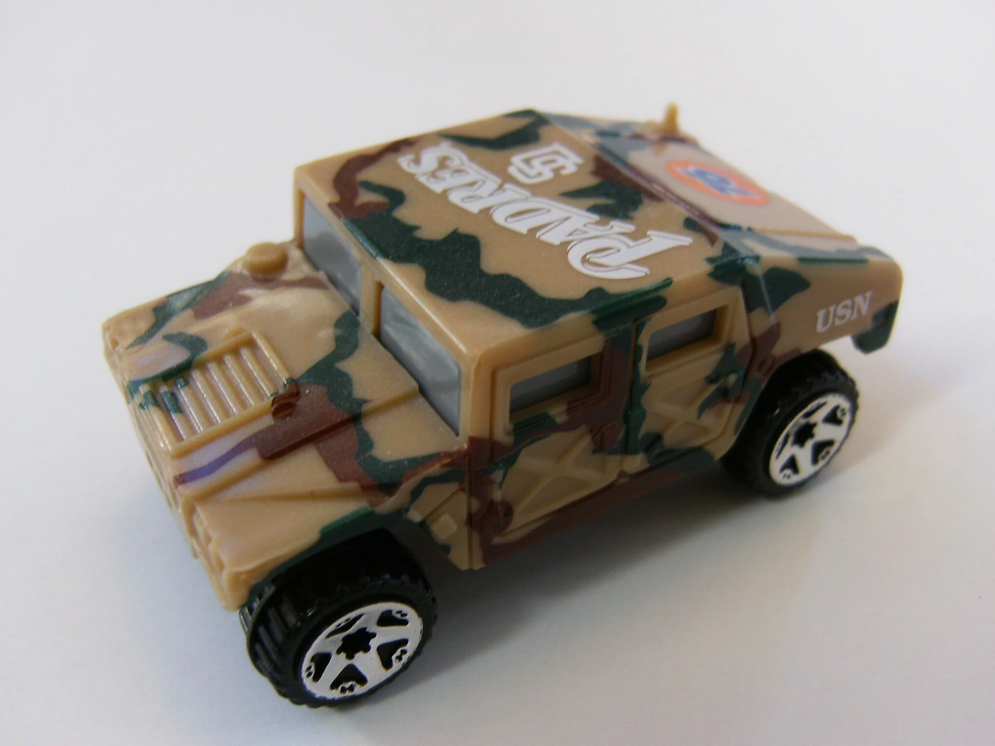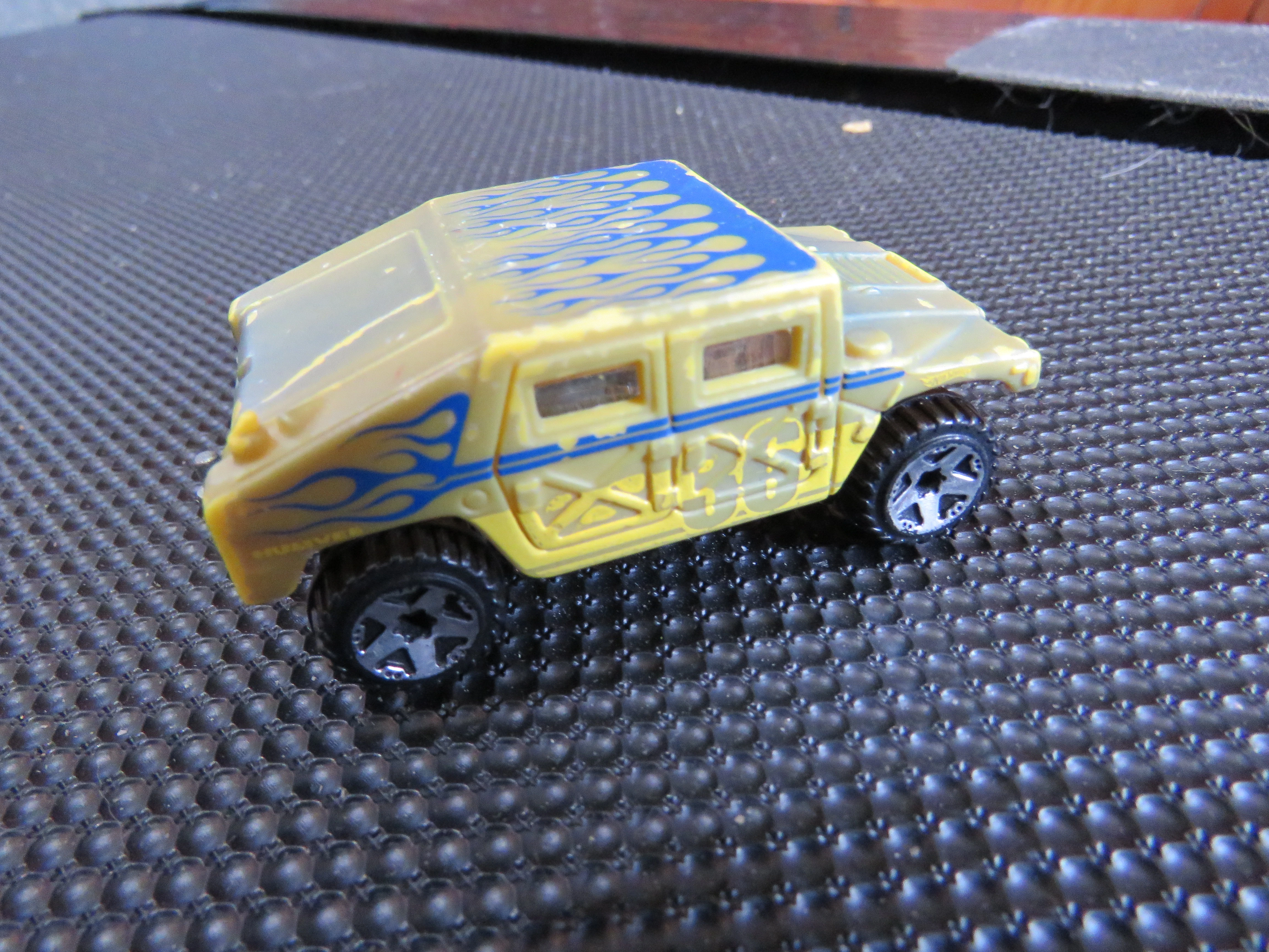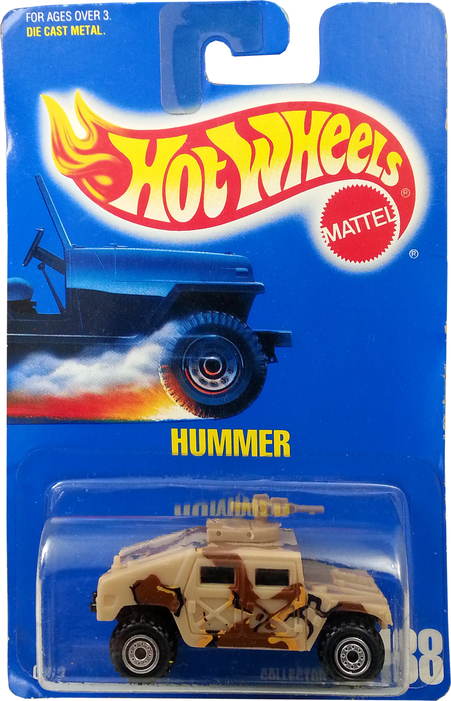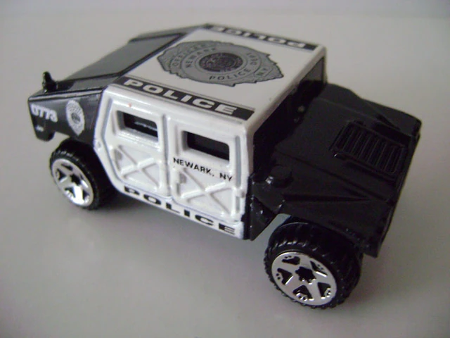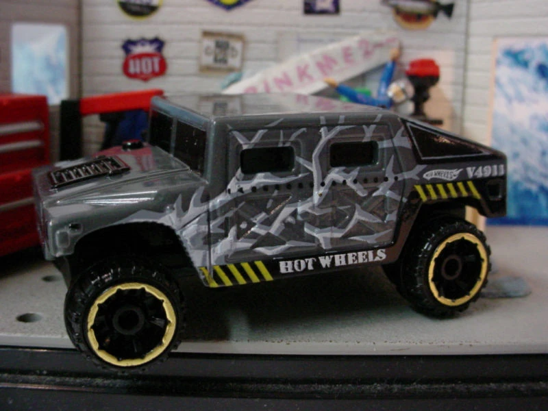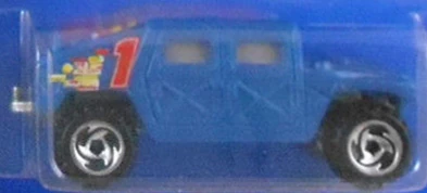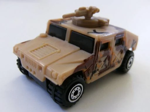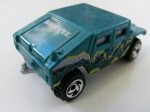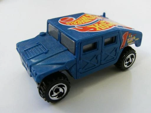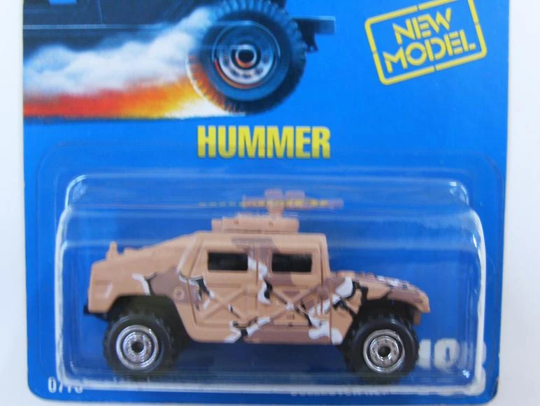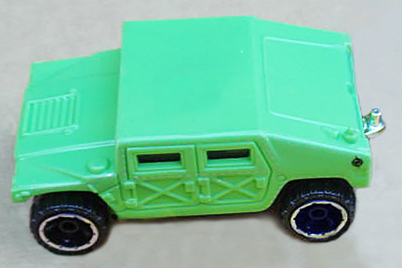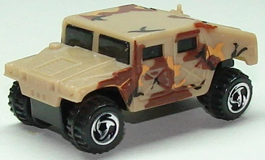 This military vehicle was initially named Hummer. By 1998, the name changed to Humvee. See also Hummer (2002). This casting has always been made in plastic, with a metal base and has been modified (retooled) several times. Original versions has a turret-mounted high-caliber machine gun. Later versions removed the turret but kept the rear opening hatch. The latest mainline releases deleted the opening hatch.