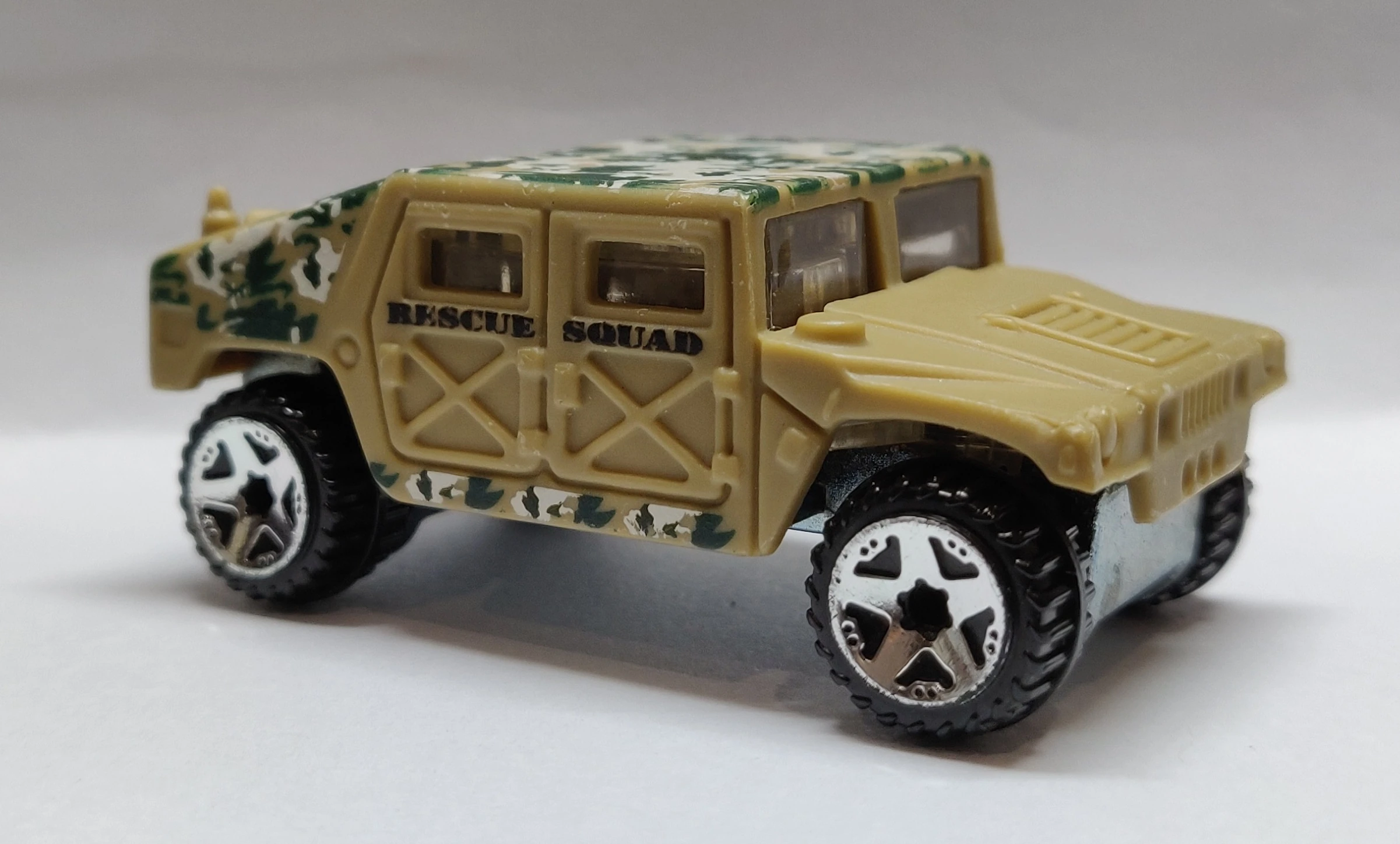 | 2008 | Color Shifters: Rescue Squad Off-Duty | Khaki -> Olive Green | Olive & White Camouflage, "HW-1138" on hatch, "RESCUE SQUAD" on sides | ZAMAC | Clear | OR5SP | N4442 | Thailand | AM General Corp.on base Paired with Dodge Charger SRT8 Base code(s): B02 |