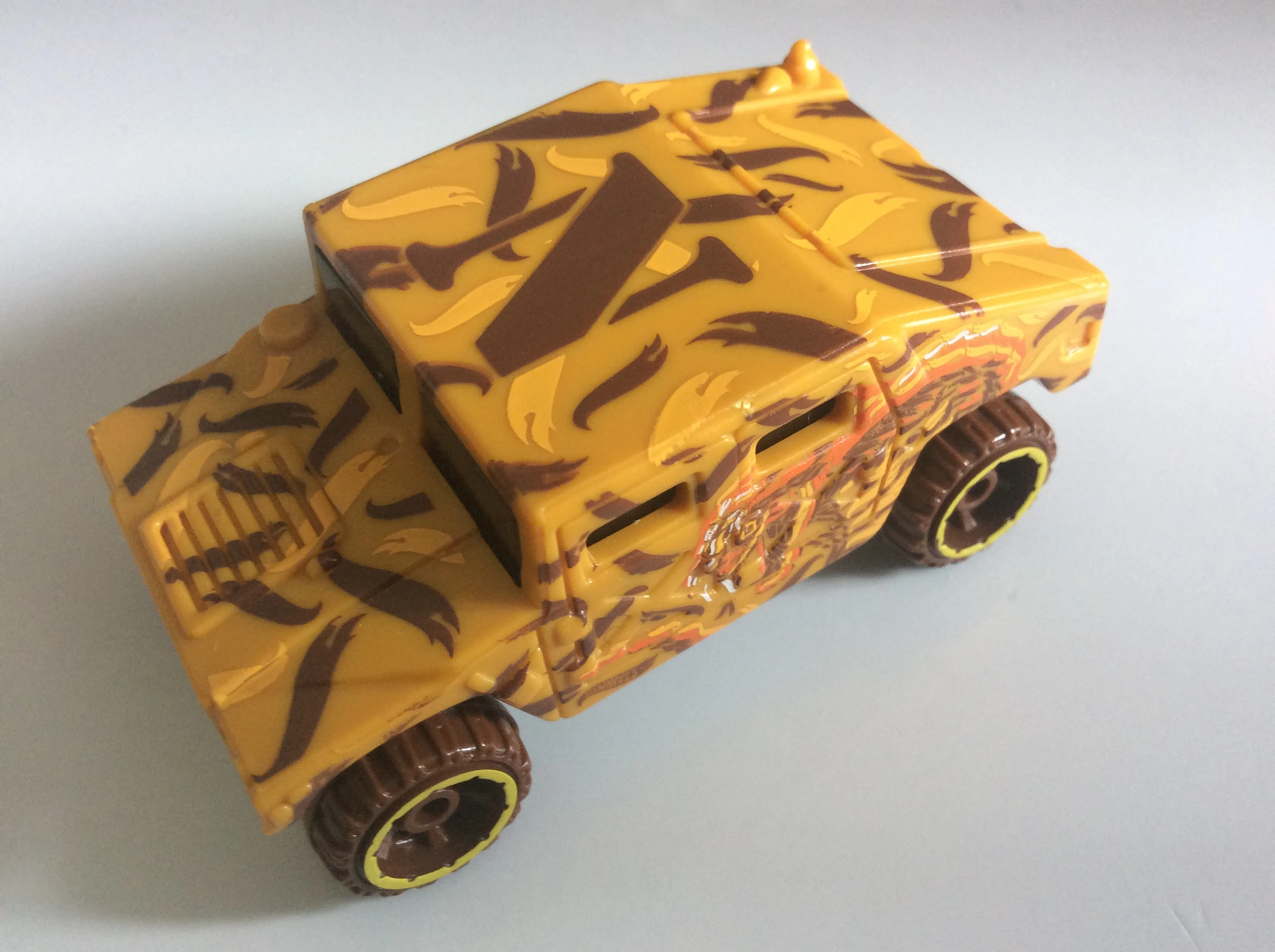 Yellow | Leopard spotted camouflage, Red markings on lower sides, Red Africa shape over black on rear hatch, warrior mask/shield tampo on roof. | ZAMAC | Red | OR5SP | B3876 | Thailand | Short & Tall antenna variants |