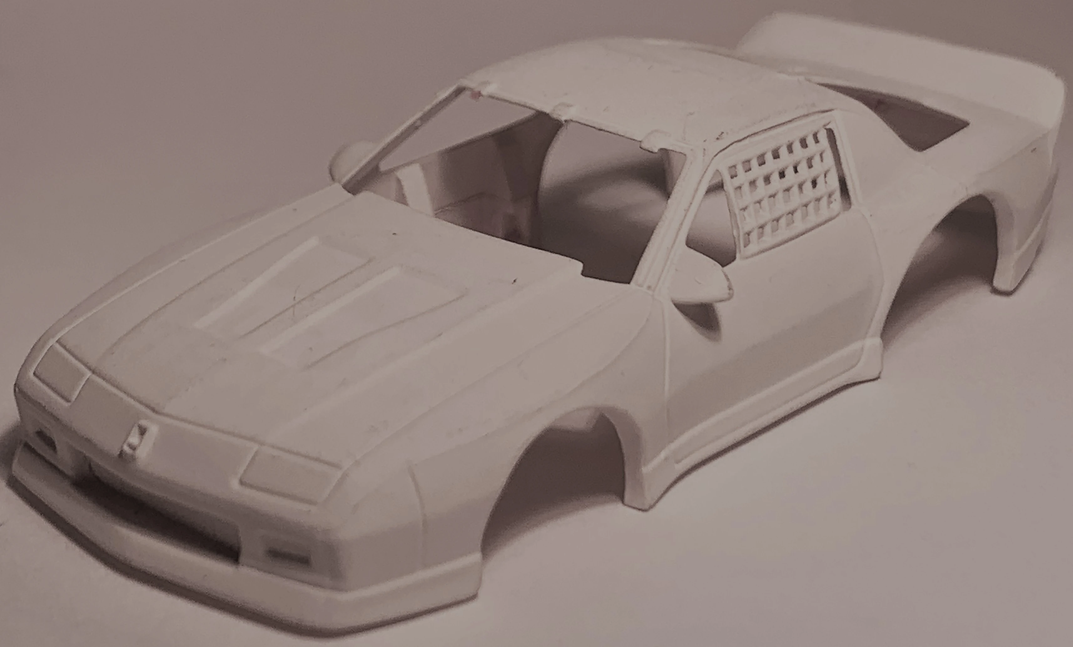 This is an Unproduced Prototype found from the Larry Wood collection. The name is not official but the current owner names it either the IMSA Camaro or the '85 IMSA Camaro, as its features strongly look like a third generation, wide body, Camaro. Kinda like a 1985 Chevrolet Camaro IMSA GTO. The casting is a Plastic body, might've once been Red but painted over White.