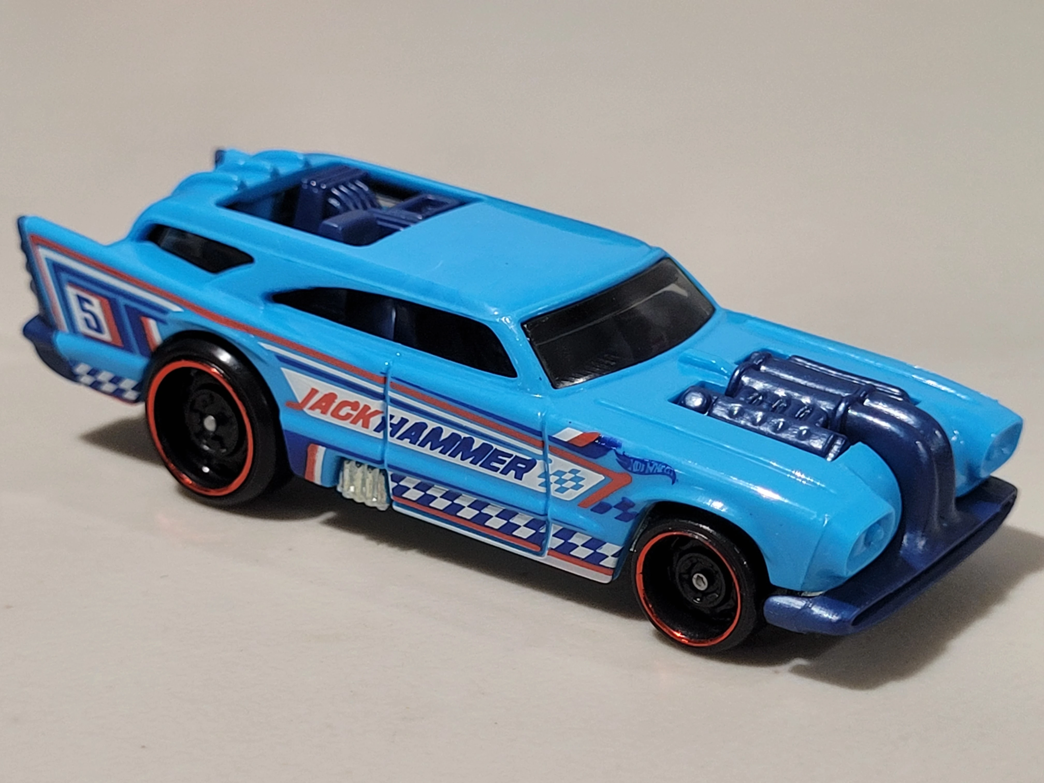 Light Blue | Blue, White, and Red checkered flag tampo, "JACK HAMMER" and "5" on sides | Unpainted / Metal |