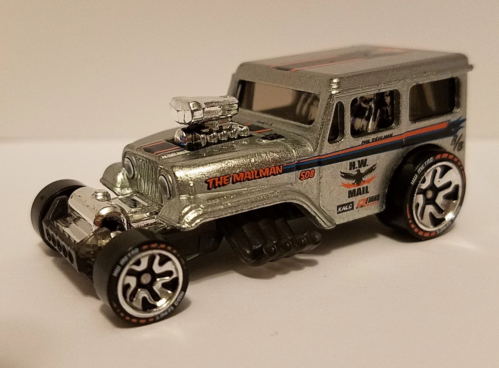 Clearcoat ZAMAC | Stripes, "The Mailman", "H.W. Mail", racing logos, HWID logo, detailed headlights, taillights | Tinted (Black) / Plastic |