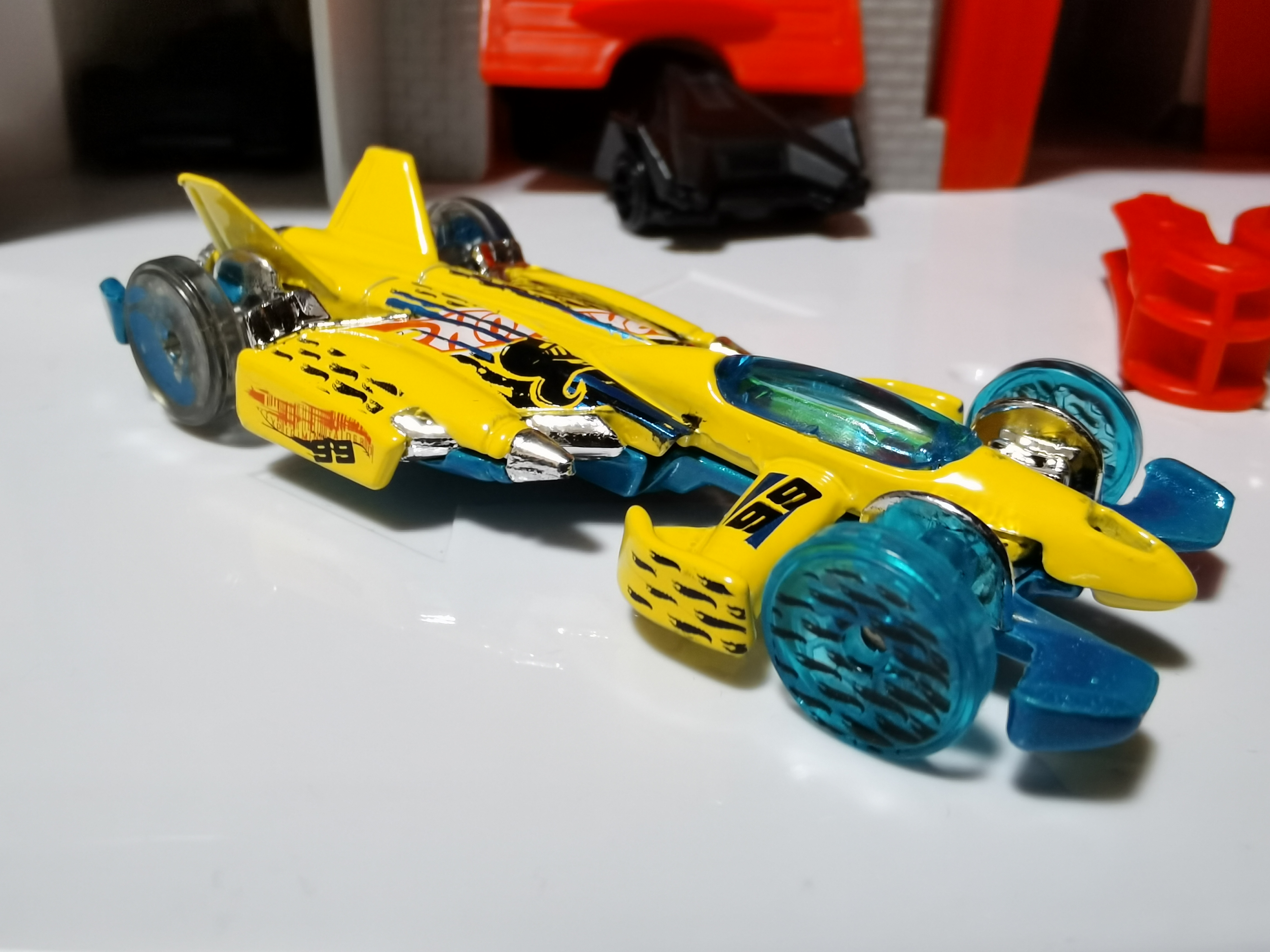 Yellow | Black checkers, Red & White HW logo crossed with Blue stripes,No.99 on sides | Metallic Blue / Metal |
