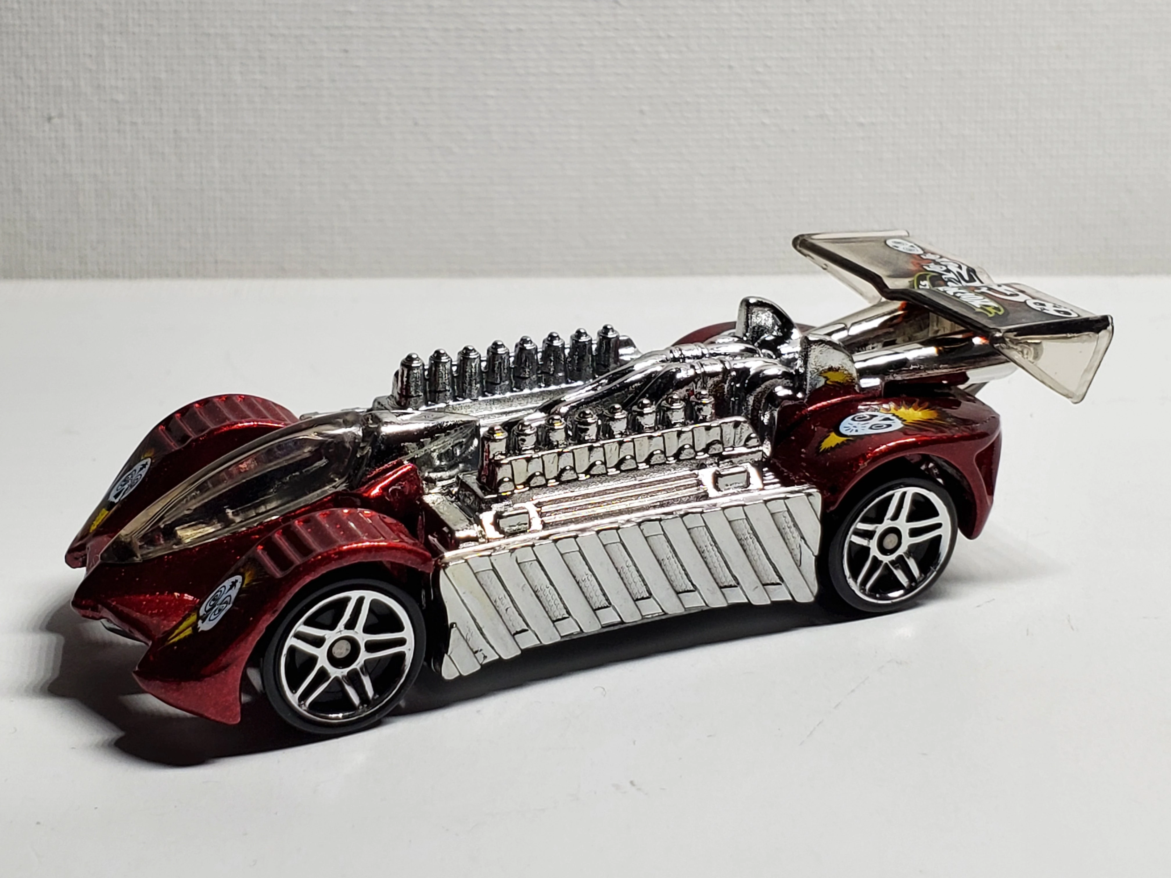 Metalflake Dark Red | Red, Yellow, Black, and White tamps with Hot Wheels logo and "Grave Rave" on wing, Grave Rave logos on top of fenders | Unpainted / Metal |