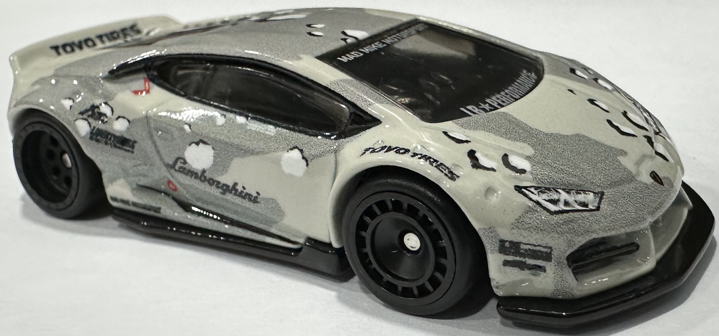 Glossy gray | Detailed headlights and taillights, dark gray camouflage pattern, sponsors on sides, Toyo Tires logo on wing, "MAD MIKE MOTORSPORTS" on windshield | Black / Metal |