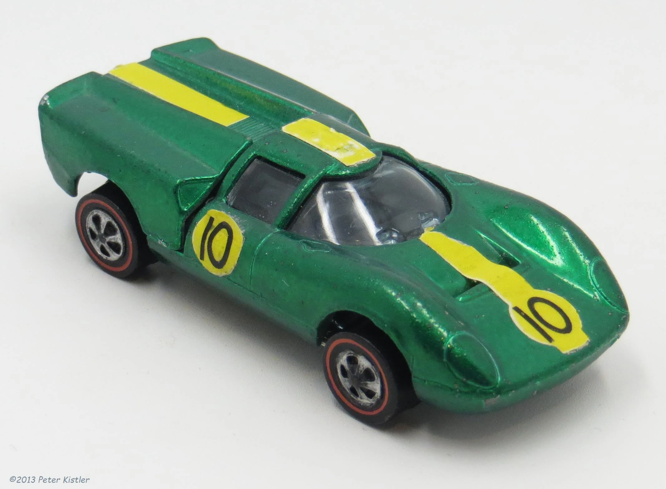 The Hot Wheels version was called the 'Lola GT70' and first released in the 1969 'Gran Prix' series. It was produced in a large variety of 'Spectraflame' colours as well as enamel 'British Racing Green', it also came with a sticker sheet with yellow stripes and a #10. The casting featured an opening rear hatch which revealed a detailed engine. The GT70 was manufactured in both the Hong Kong and USA facilities, with differences being HK cars had blue tinted glass and the USA cars had clear glass. The Lola GT70 has not been seen since.