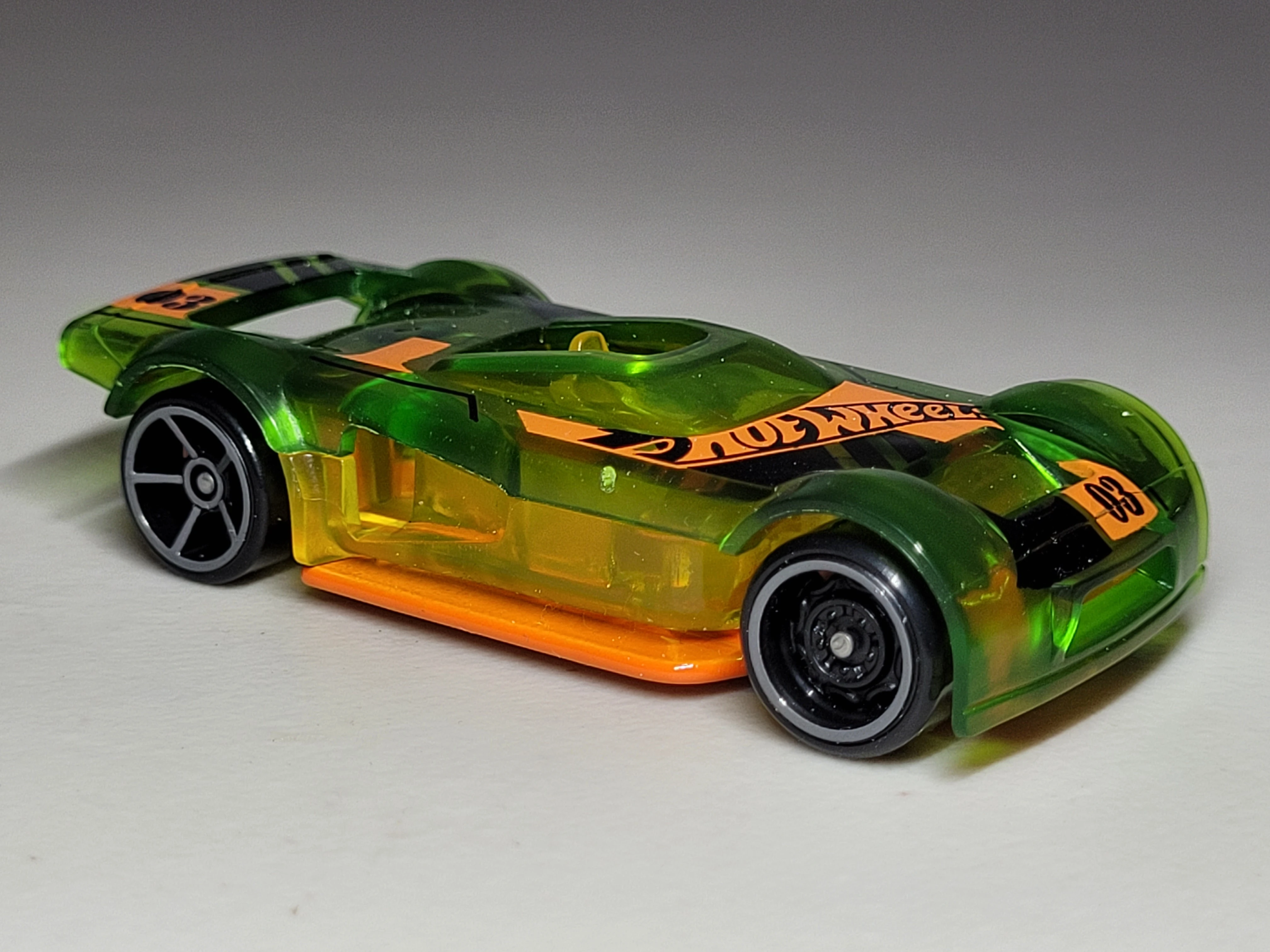 Clear green | Black & orange stripes, "Hot Wheels", "03" on body | Orange / Metal |