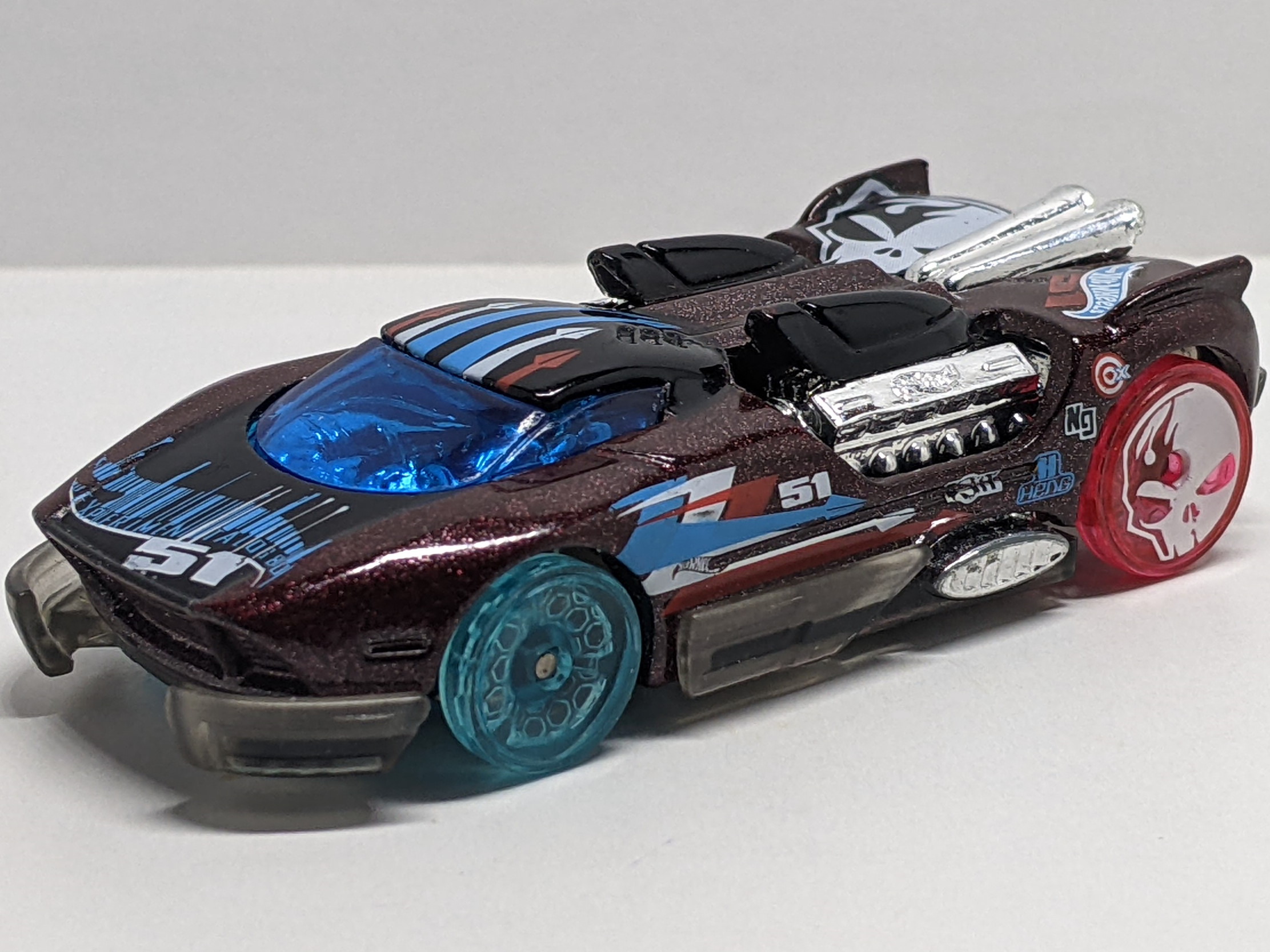 Metalflake Maroon | Black, Blue, Red, & White stripes & tampos on top and sides, "51" on hood and sides, White skull on rear wheels | Tinted / Plastic |