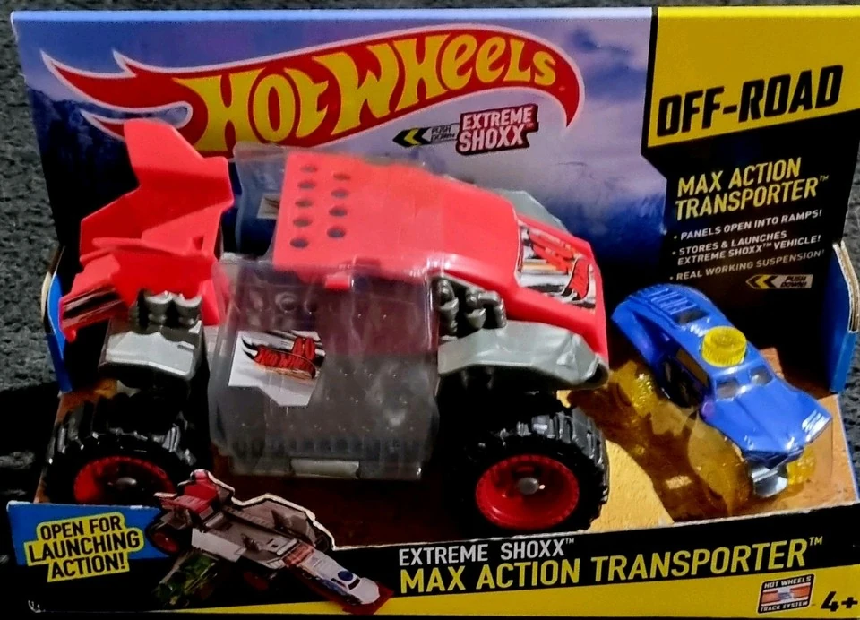 The Max Action Transporter was a playset designed for the Extreme Shoxx line. It features a space for one vehicle, a launcher and panels that fold out into ramps, and working suspension.