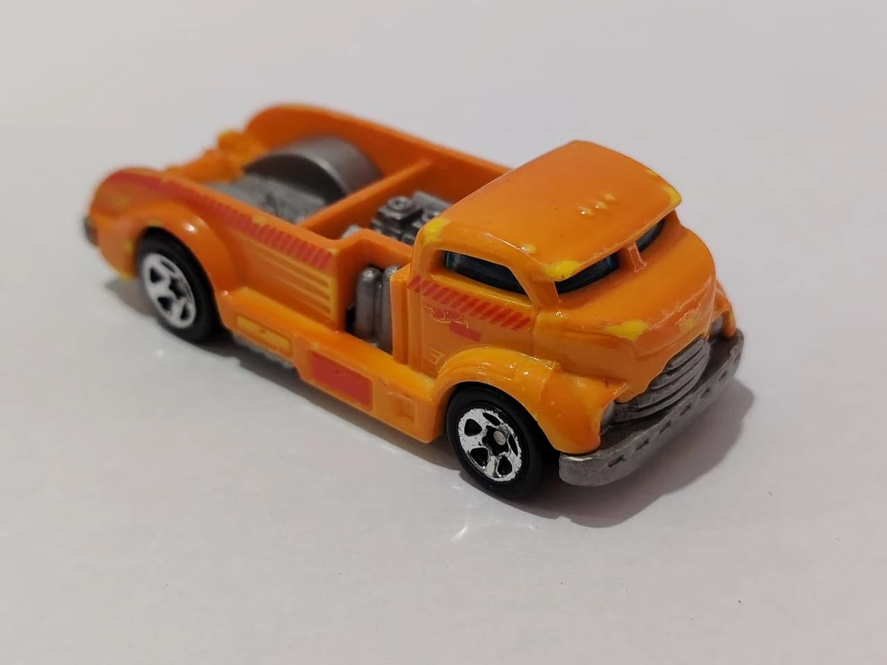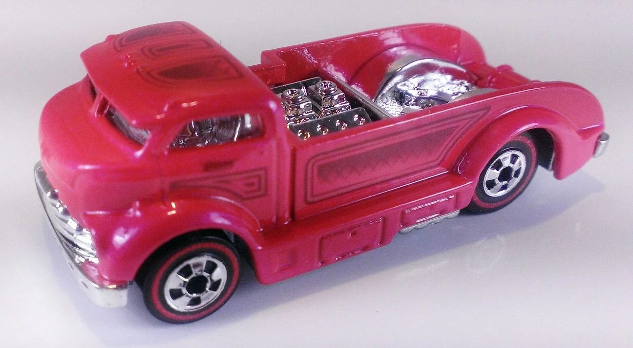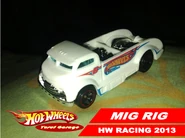 Mig Rig is a depiction of a heavily modified 1950s-style cab-over-engine truck, with modifications such as a chopped roof, mid-mounted V8 engine, and nitrous. The casting's bed also features welding gear, a hammer, pipes, a jack, and a 4-way lug wrench.