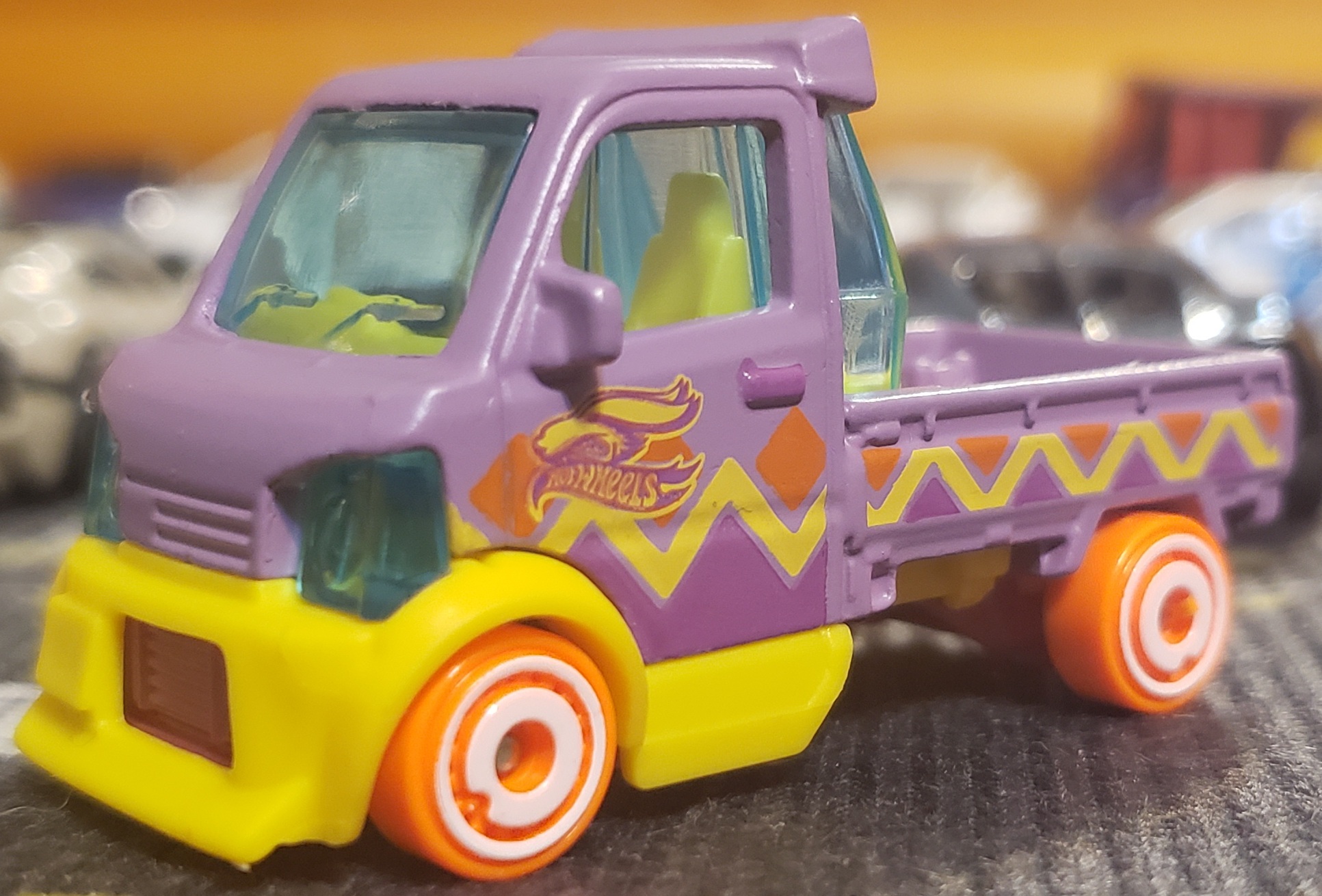 Matte Lavender | Orange, yellow & purple zig zag pattern, HW & bunny log | Dark Pink / Plastic |