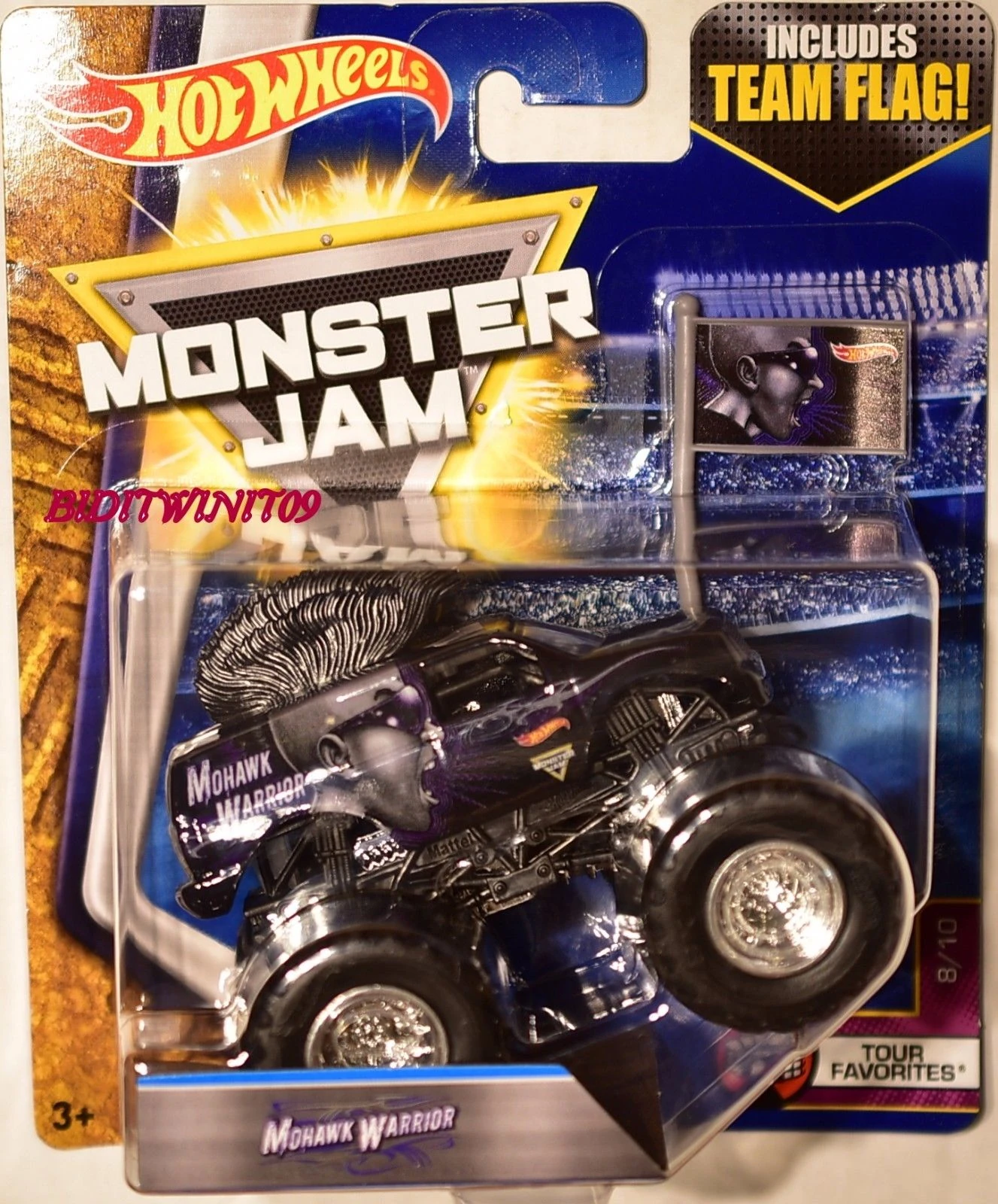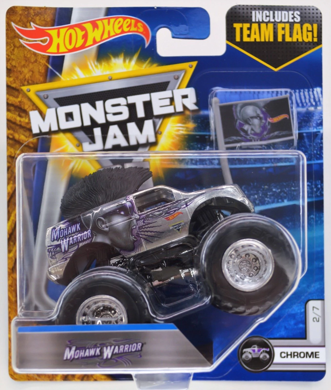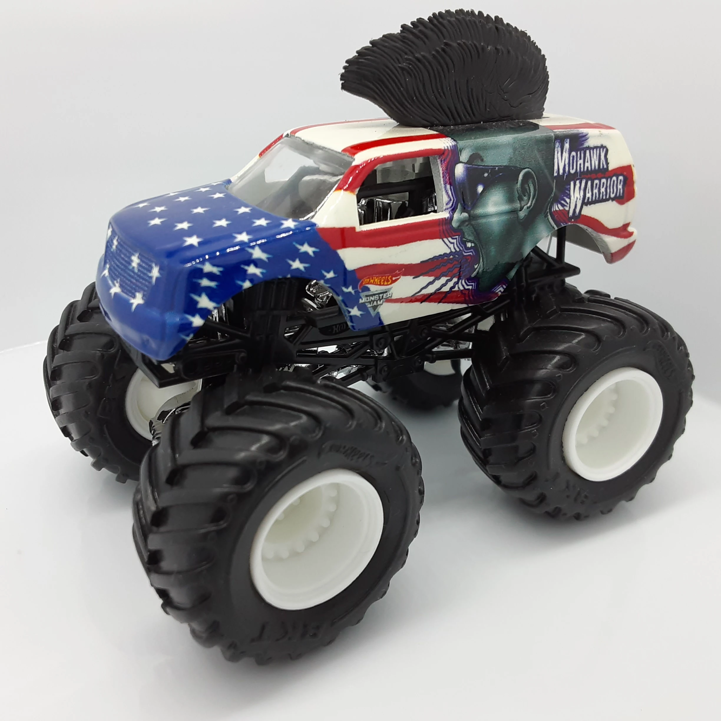 Mohawk Warrior is a truck owned by FELD Motorsports. Mohawk Warrior debuted at Monster Jam World Finals 11 as an encore performance and has been in competition since late 2010. The truck gets its name from the original driver, George Balhan, who is known for his mohawk and is the successor to Escalade. The truck is probably most famous for the giant mohawk featured on the truck's roof. A purple Mohawk Warrior Hot Wheels toy was released in 2015, but was not made into a real truck until 2017 when it debuted in Saudi Arabia.