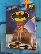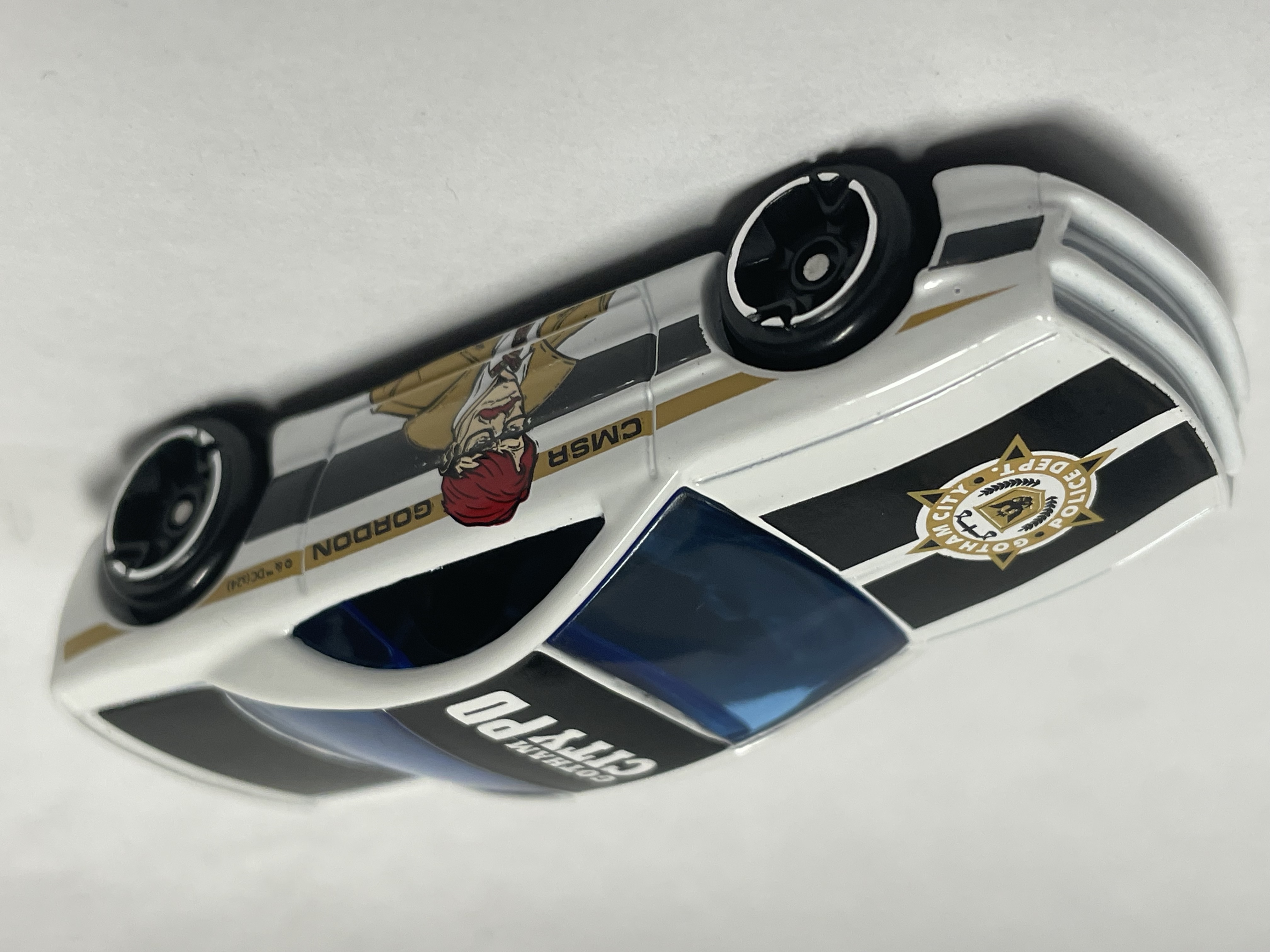 White | Black stripe, "CMSR GORDON" on gold stripe, & Commissioner Gordon character on sides; "GOTHAM CITY PD" on black roof; Gotham City Police Dept. emblem with black stripes on hood; black trunk; detailed taillights | Black / Plastic |
