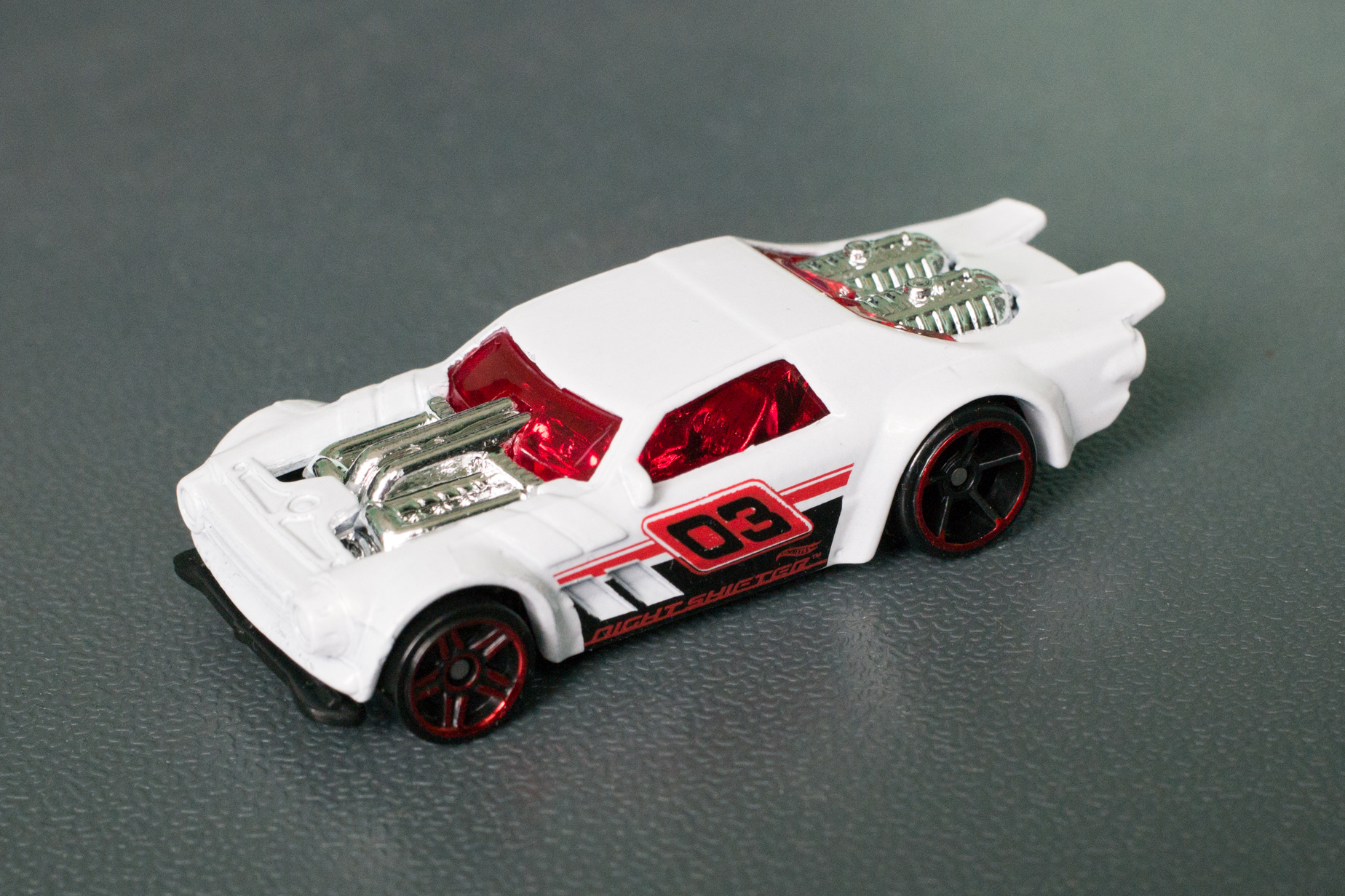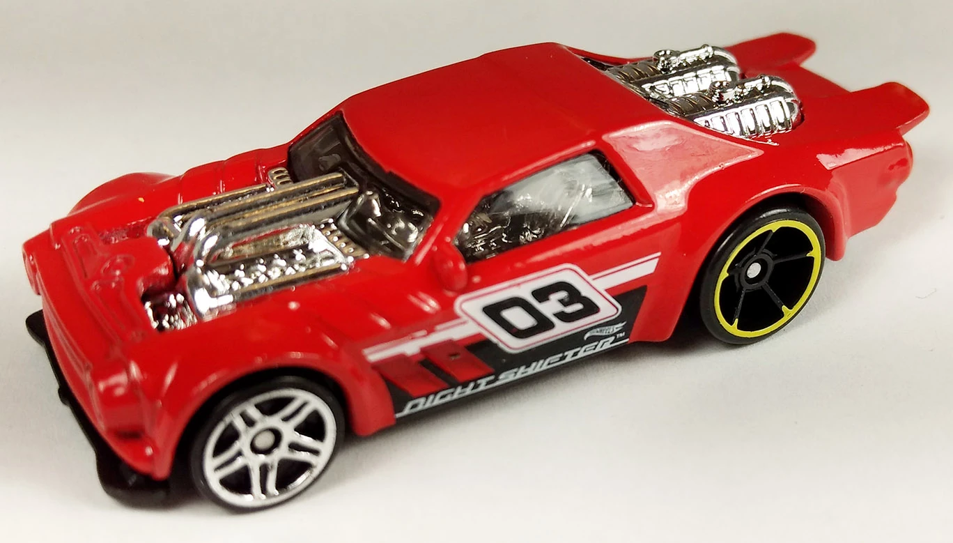 Night Shifter is a heavily modified muscle car featuring an exposed engine and two aircraft fuel tanks on the trunk lid. Since it was introduced, the Night Shifter has been featured in a significant amount of Hot Wheels marketing material and media.