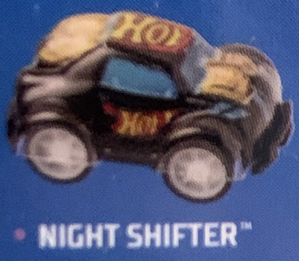 The Finders Keepers Night Shifter is a small pure plastic version of the car with it being based on a non-existent white HW Race Team version of its diecast counterpart. Like all cars in the Finders Keepers line, it consists of an edible chocolate egg with a promotional toy (In this case being a Hot Wheels car) inside a capsule.