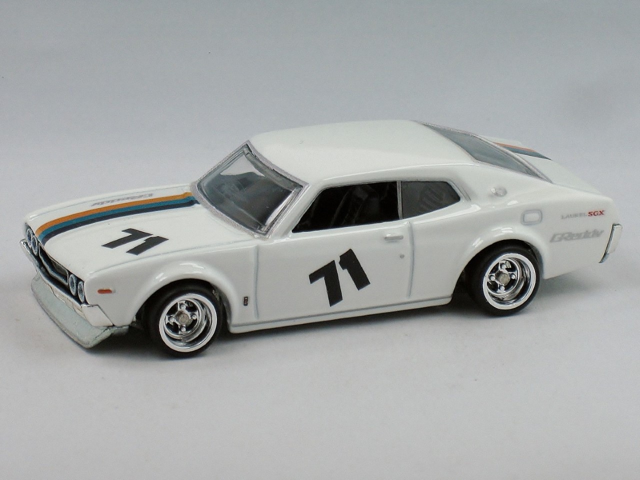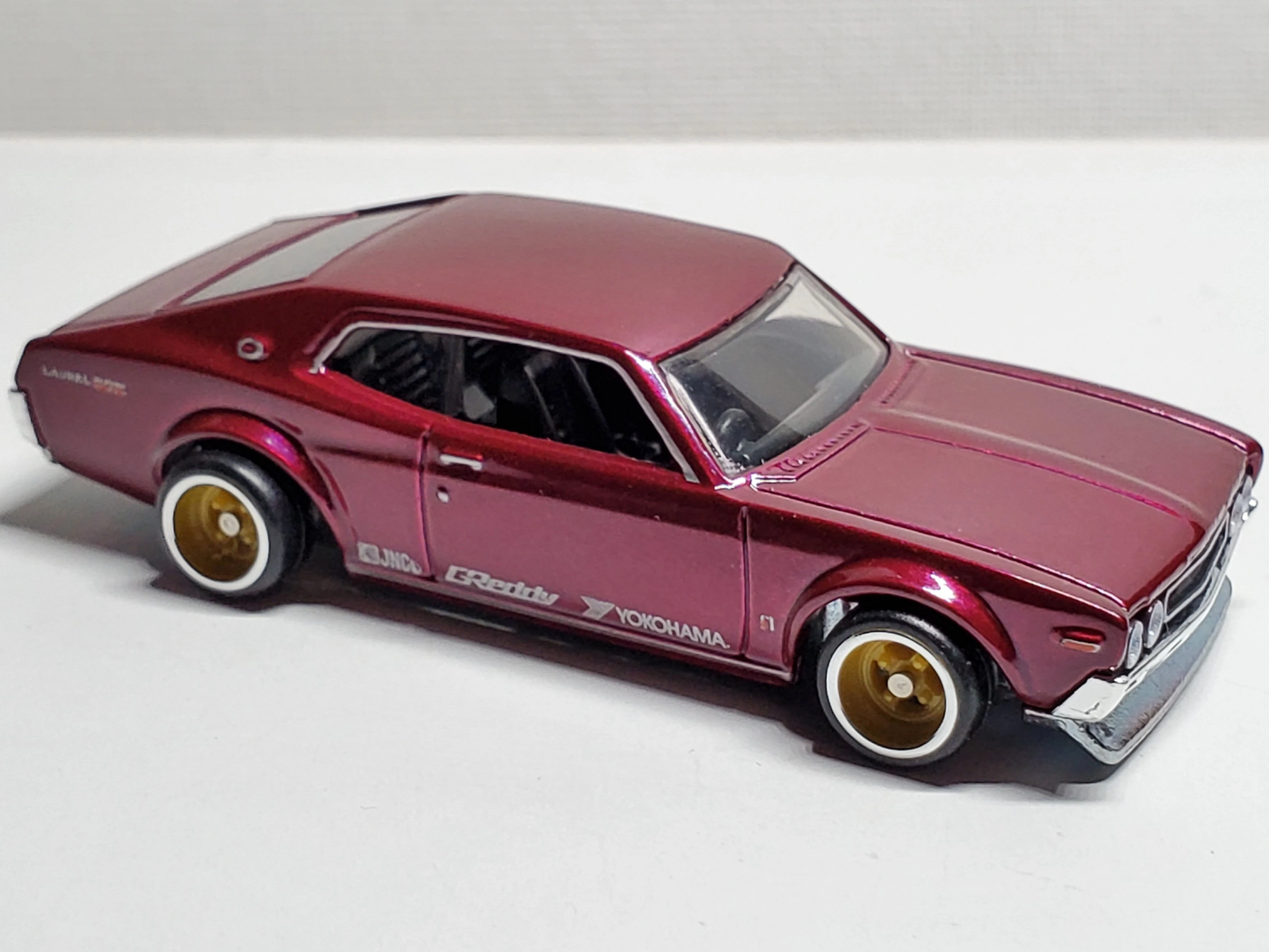 For the release of the Japan Historics 2, Hot Wheels gave collectors two new castings; the Nissan Skyline C210, and the Nissan Laurel 2000 SGX. The latter is the Second-Generation (1975) Laurel, Chassis C-130 in Hardtop (2-door) "SGX" trim. This means (among other enhancements) independent rear suspension and a six cylinder 2.0L 1.998cc 121,7cu 125hp (L20A) engine with a 5-speed transmission. Having distinctive "coke bottle" lines, this car was affectionately known as the "Butaketsu" Laurel. Hot Wheels presents its Japanese Domestic Market Laurel in clean "Kyusha" style with an authentic metallic green, with minimal decal or markings other than the GReddy, JNC and "Laurel SGX" tampos. It features a lowered stance, fender flares, low-profile rubber wrapped around small-diameter Mini Classic 4-spoke Real Riders and a large front spoiler, which is part of the metal base.