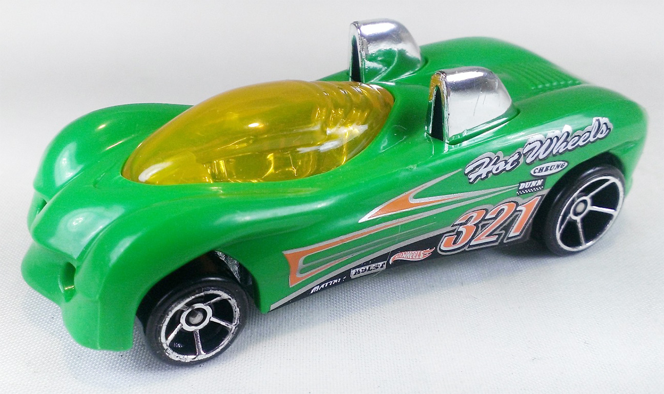Lime Green | Orange, Black, Silver & White tampos, 'Hot Wheels', '321' & race deco on sides | Unpainted / Metal |