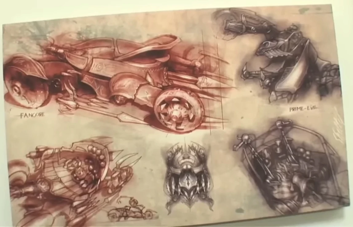 Fangore and Prime Evil concept art from a wall in the Design Center