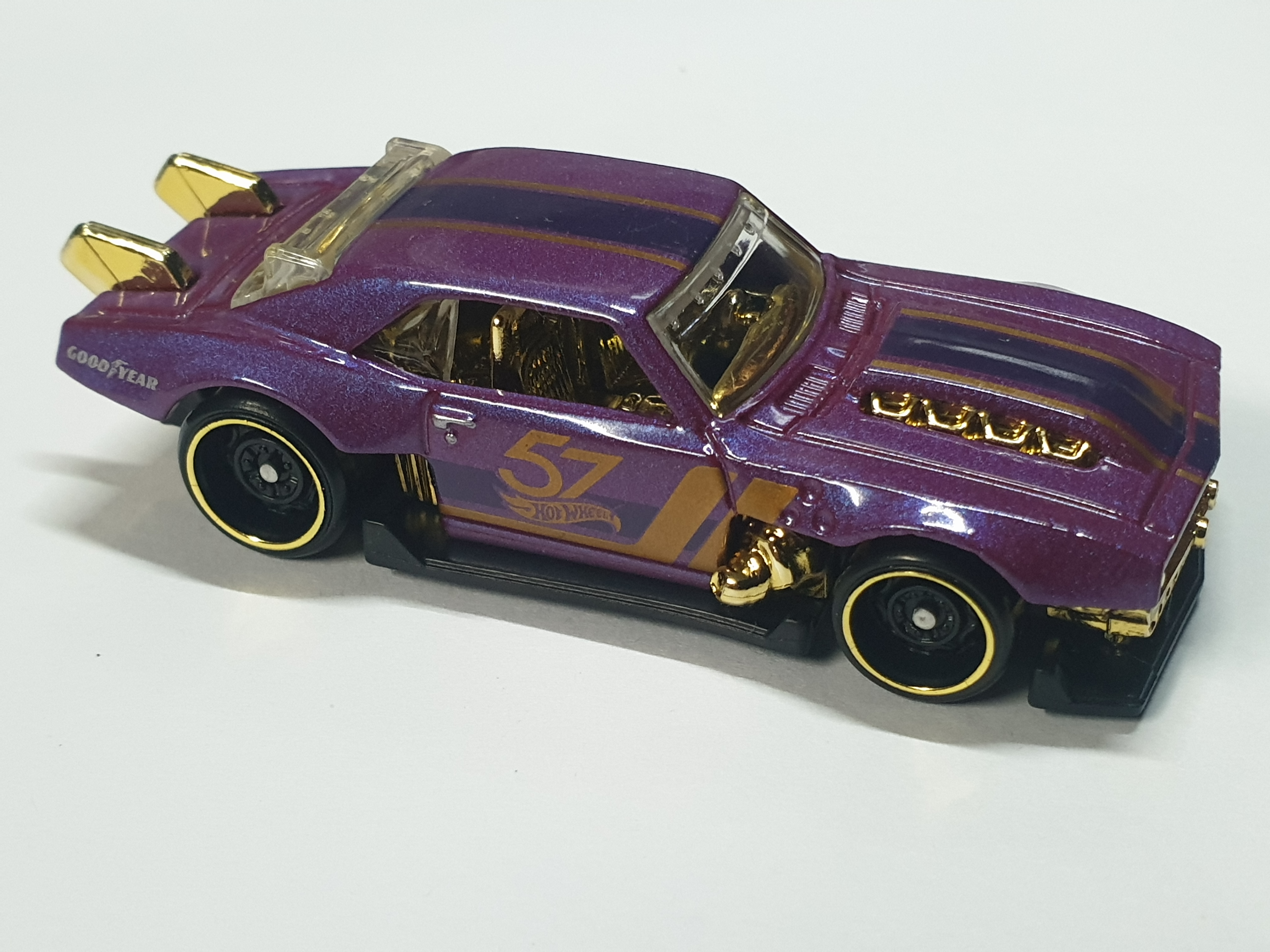 | 1/6 | JDM26 | Custom '68 Camaro | Metalflake plum | Gold & purple stripes on sides, hood, & roof, Hot Wheels logo, "57", & Goodyear logo on sides | DD8 | Base code(s): U05N |