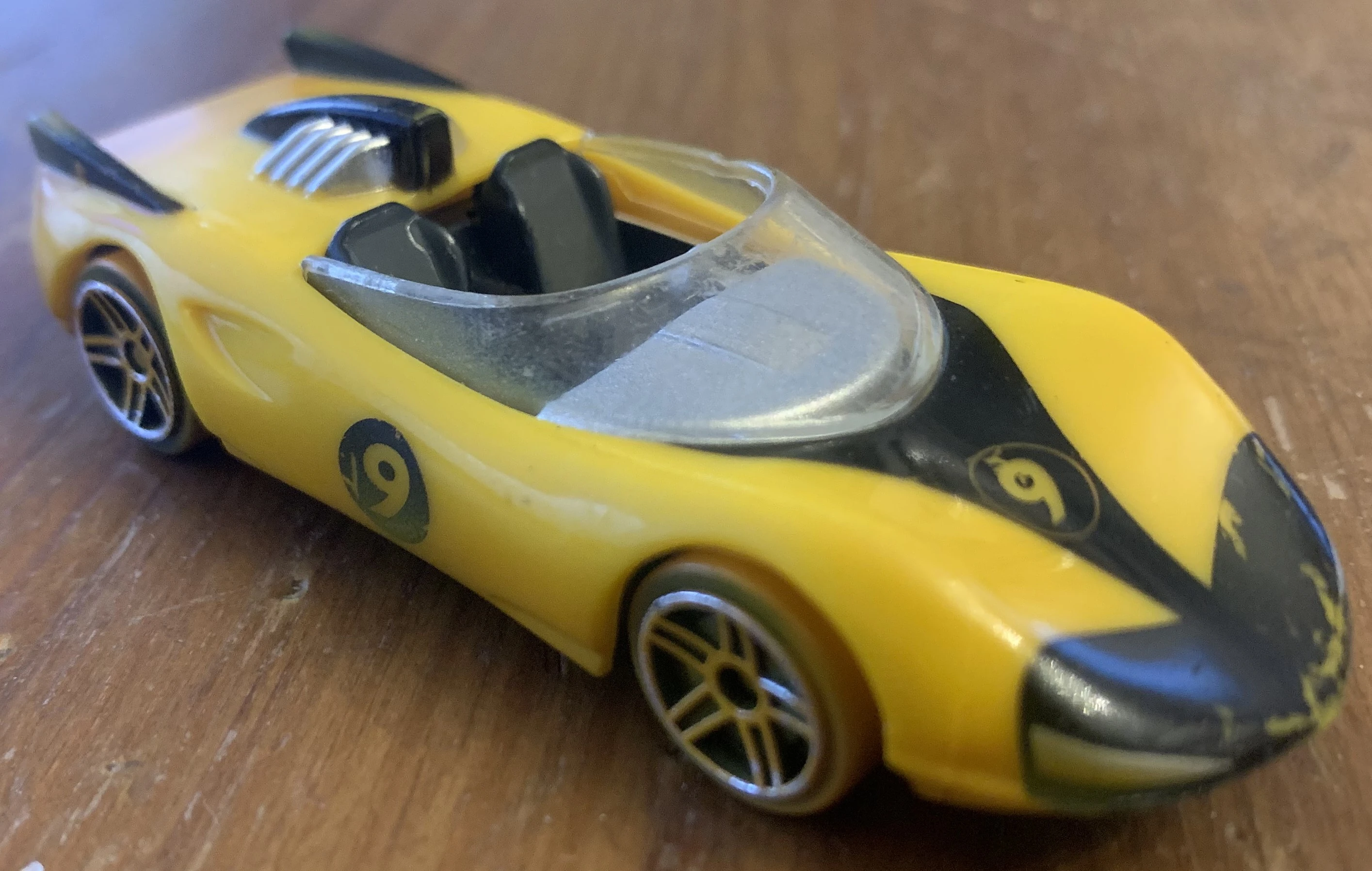 Yellow | Black '9' on sides, black '9' on hood with stripe. White spray effect on underside. | Black / Metal |