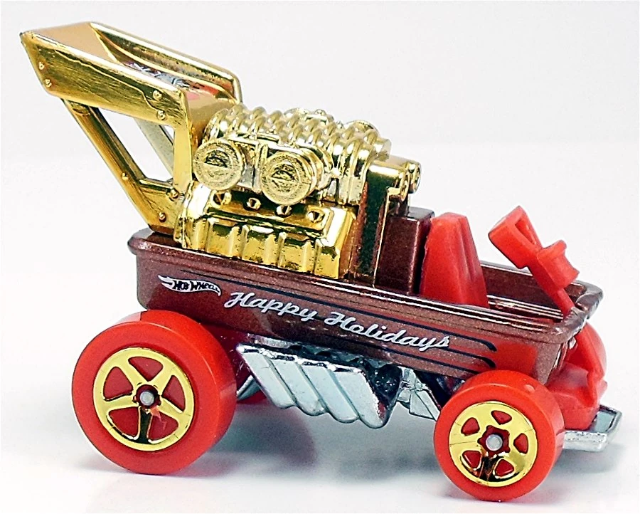Metalflake Copper | Red & Black stripes on sides & top of wing, 'Happy Holidays' on sides, HW holiday logo on top of wing | ZAMAC | Red | Gold Chrome Rim, Red 5SP | BDL13 | Thailand | Named Draggin' Wagon Base code(s): |