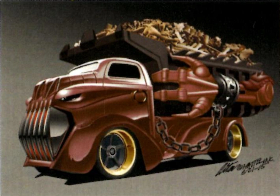 This is a depiction of a Rancor from the Star Wars franchise. It features a tilting dump bed with a removable load of bones.