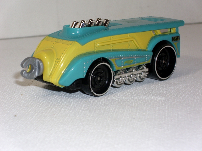 | V0145 | Super Steamliner | Turqoise | Black & Silver "6811", Yellow HW Logo, "Hot Wheels Rail Co" on flat car | Black | Chrome | Black w/ chrome rim | ![]()