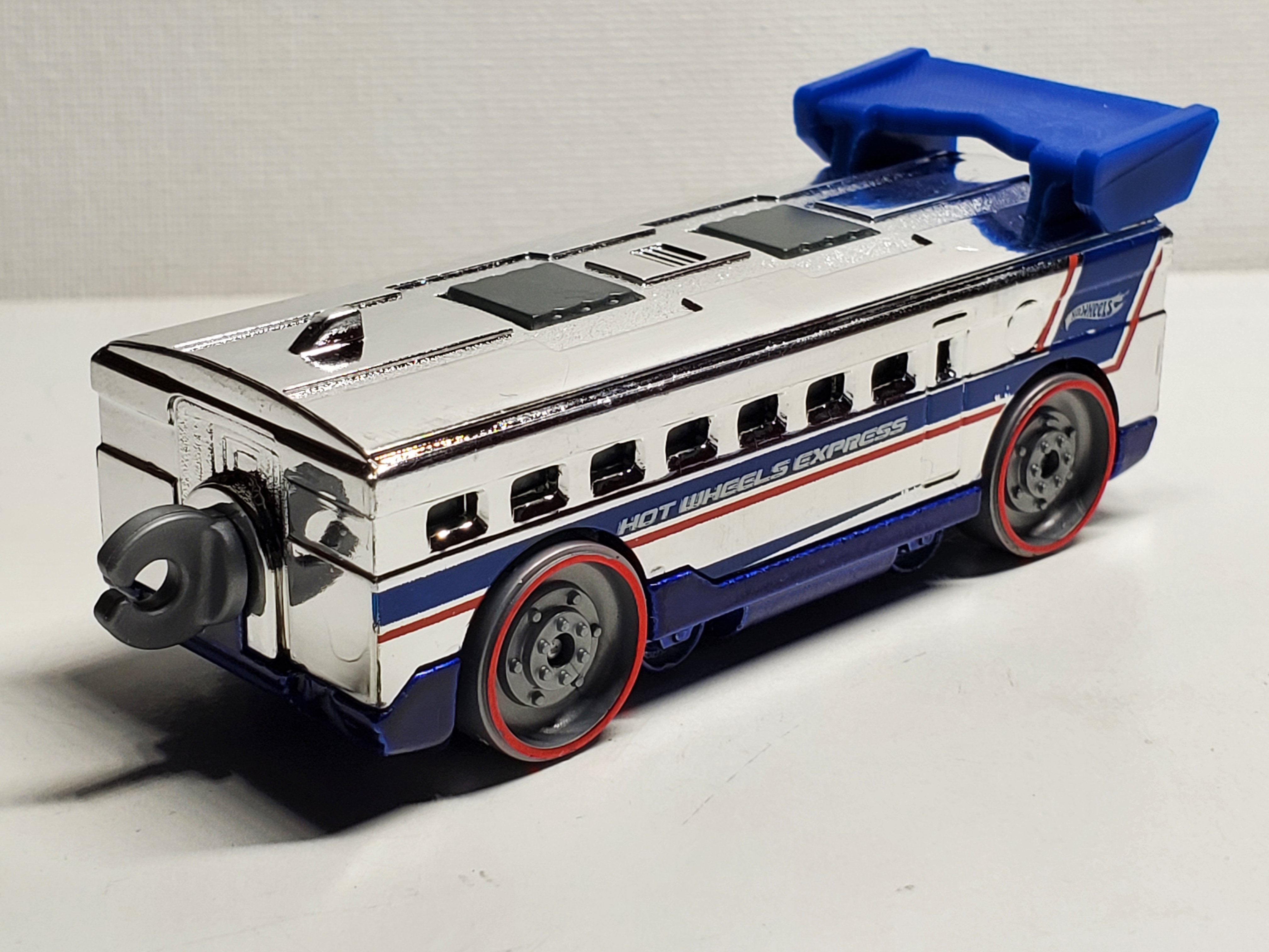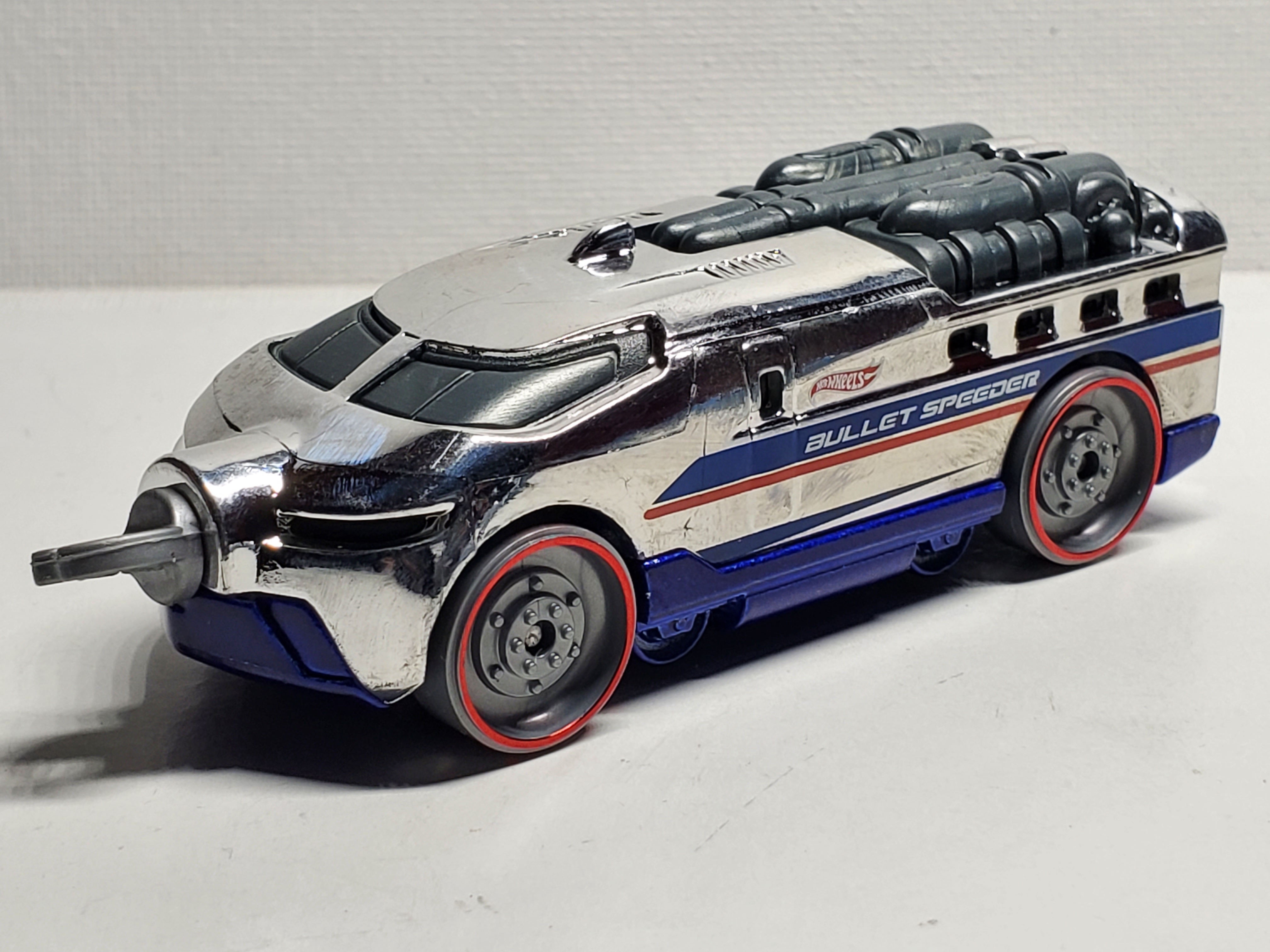 | W4421 | Bullet Speeder | Chrome | Blue & Red Stripe, HW logo, "Bullet Speeder" text on engine, HW logo, Blue & Red Stripes, "Hot Wheels Express" text on car. | Metalflake Blue | Grey | Grey w/ red chrome rim | ![]()