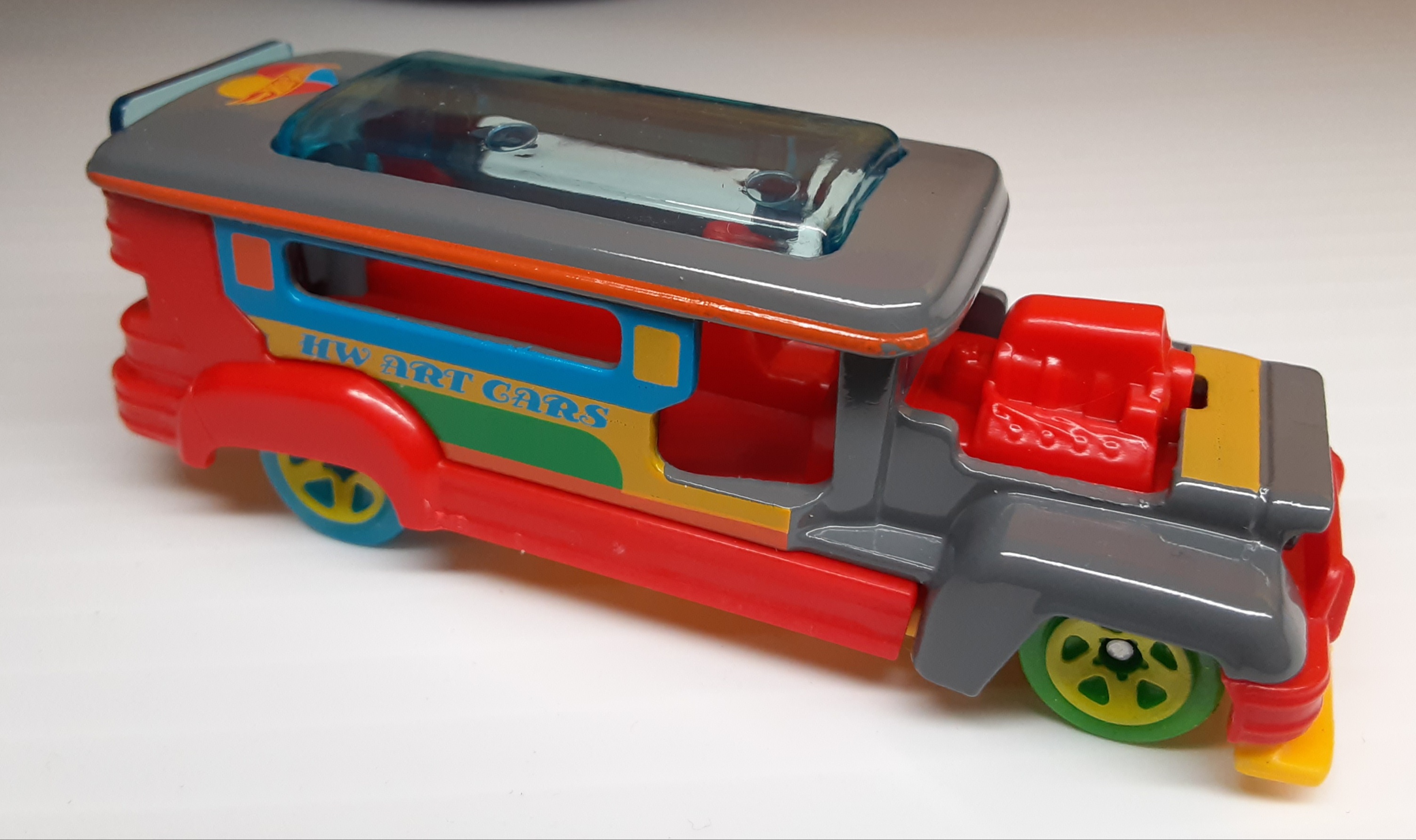 Dark Gray | Yellow, orange, blue, green, and red or fiesta colors alternating, “HW Art Cars” on sides. Hot Wheels logo with a yellow, red, and blue ❤️ on top. | Yellow / Plastic |
