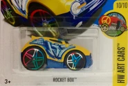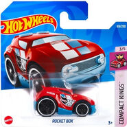 Rocket Box is a heavily-modified futuristic Blings-styled hatchback. The casting features a logo on the rear that highly resembles the Volkswagen logo, but featuring the initials "HW" for Hot Wheels, instead of "VW" for Volkswagen. The First Edition version came out with many variations ranging from tampos, the number used on the side, paint finishes, and base colors. The tooling for the car was modified in 2011; the rear no longer features the transparent plastic insert and now features a plastic base.