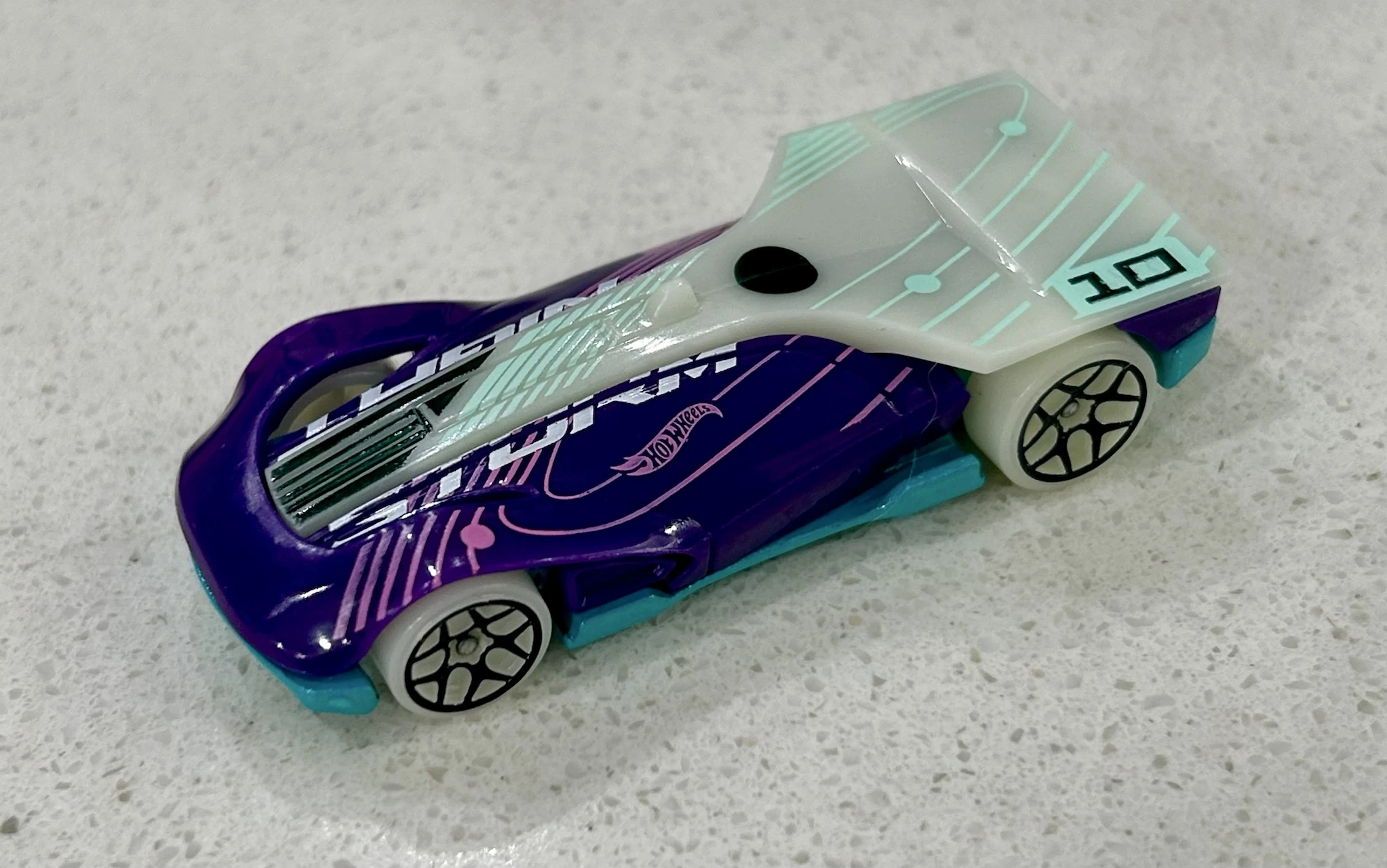 Purple | Blue camo design on side, hood and wing, "5" on front and sides, "ROLLIN' SOLO" on sides and wing, "CLONE", "HWGRFX", Hot Wheels logo on wing, "NO STEP" on top | Light Blue / Metal |