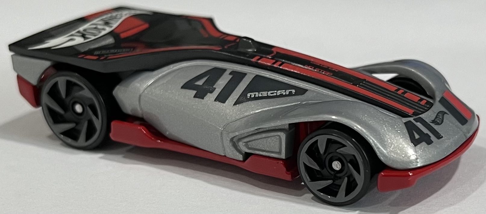 Metalflake silver | Red and silver accents, "41" on sides and hood, "MEGAN" on sides, "NO STEP", "DUNN", "HWGRFX", "LOAR CAMS" on top | Red / Metal |