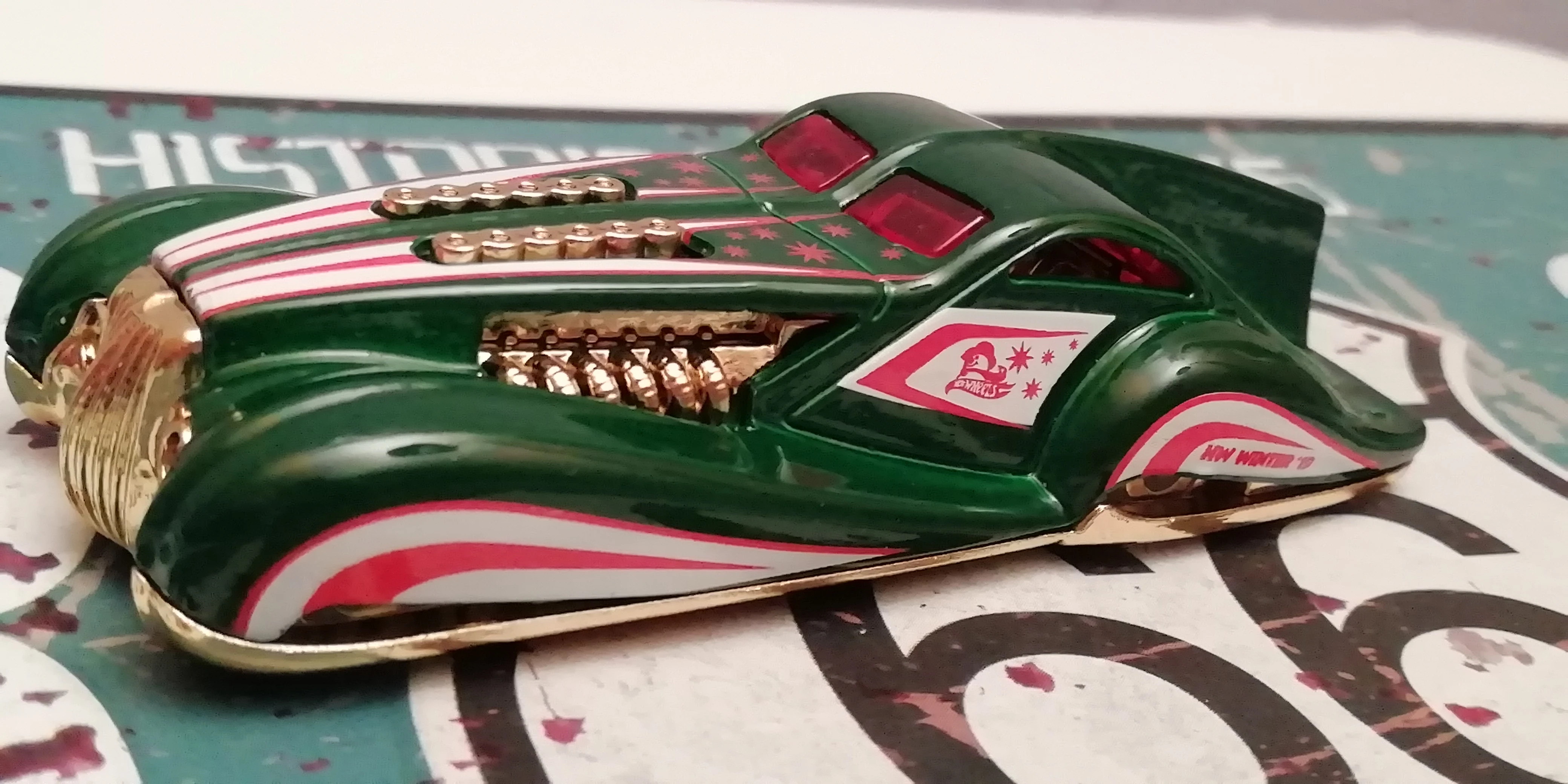 Metalflake Red | 2017, Grining Santa, Hot Wheels Logo, White Splashes on sides. White Fork Stripes on hood and top. | Green / Plastic |