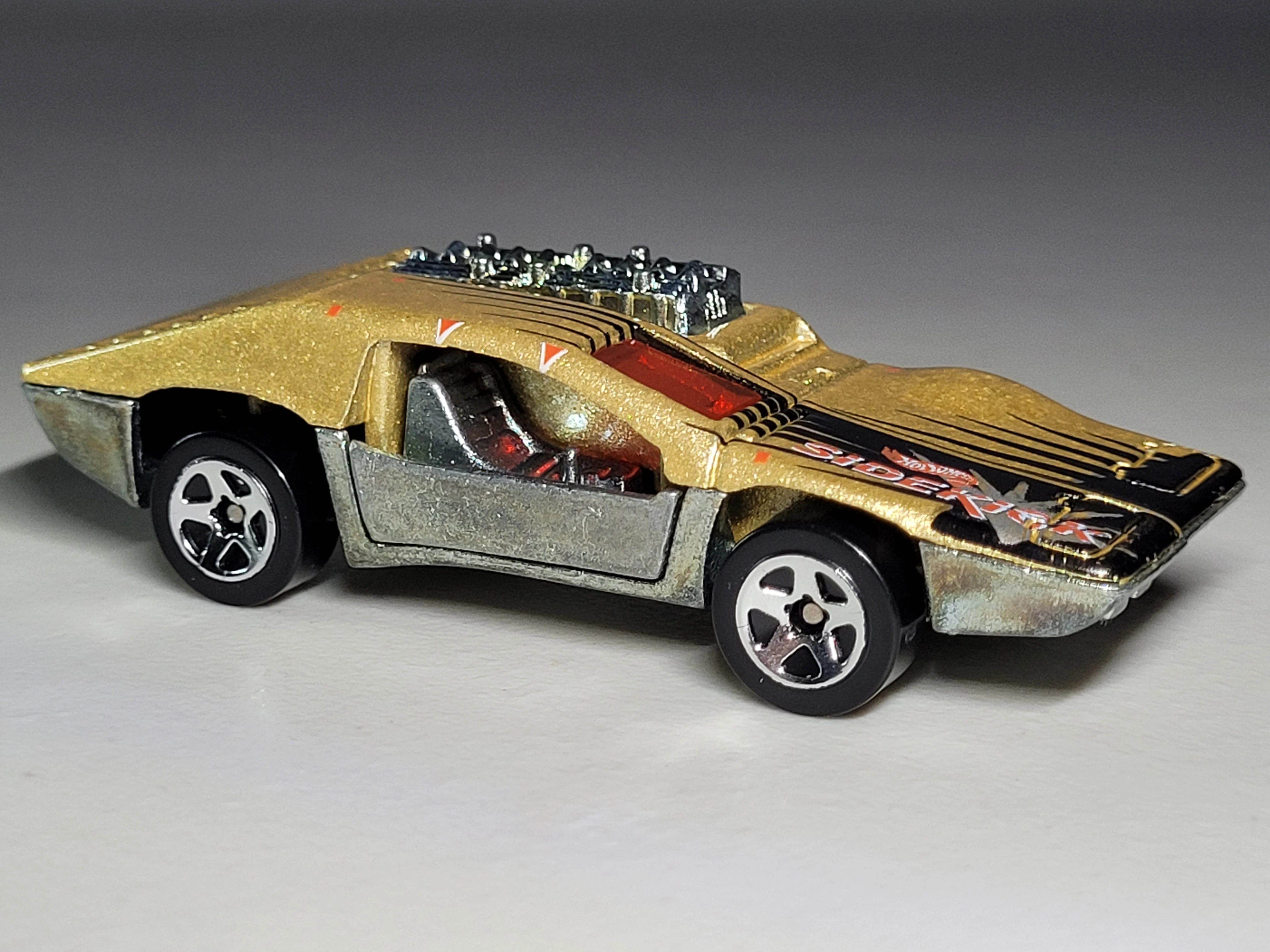 Side Kick was a car from the 1972 Hot Wheels series. It featured a right-hand side driver's seat that slid out the side when the exhaust pipes in the rear were pulled out.
