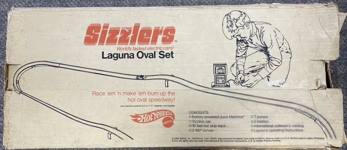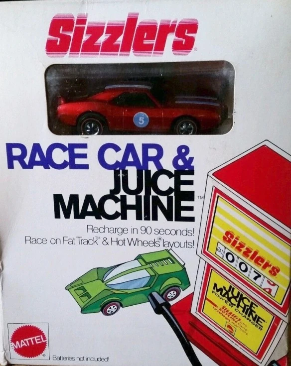 The Sizzlers were a 1970s Hot Wheels spin off with a built-in motor and a tiny rechargeable battery. They were introduced in 1970 and became an instant smash. Sizzlers run on the regular "orange" Hot Wheels track, and Mattel created special race sets with U-Turns, multi-level spirals and loops to take advantage of the cars' electric motor. Two lane race sets such as the California/8 race set were developed that allowed Sizzlers to race side-by side, until Mattel created the black Fat Track, which is three lanes wide, with steep banked curves, and designed to allow Sizzlers to run free. In action, Sizzlers display a unique, competitive "passing action" when running on the Fat Track, as if each car were piloted by an impatient driver trying to jockey ahead of the rest. The Fat Track sets included the "Big O", "California 500", and Super Circuit" race sets, and accessories such as the "Scramble Start" (a four-car starting gate), "Lap Computer" four car lap counter, and "Race-Timer" stop watch.