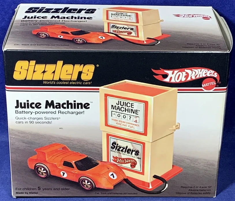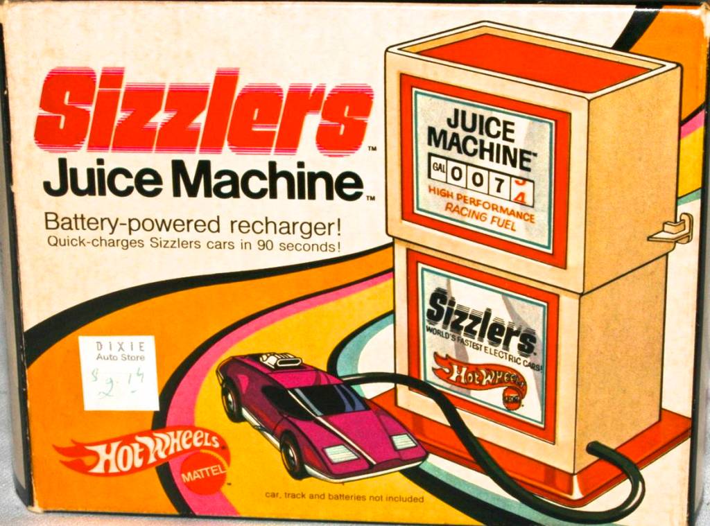 Sizzlers were (and are) charged with four or two D battery chargers called the Juice Machine and Goose Pump respectively. Later, the Power Pit was introduced—which was an electric charger that plugged into any household AC outlet and resembled a race track garage or pit stop. A 90-second charge of the tiny internal Ni-Cad battery gives up to five minutes of frenetic run time. It has been said that the 90-second charge time was "the longest minute and a half in a kid's life" as they waited impatiently for the car to charge sufficiently to get back into the race. In 2007, the series was rebooted and exclusive to Target. All were made in China and had NCRL wheels. The series was discontinued by 2009.