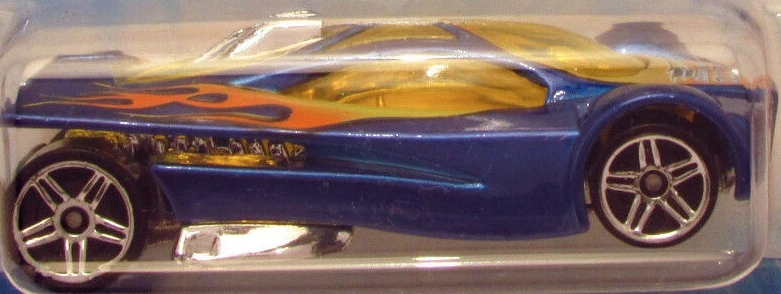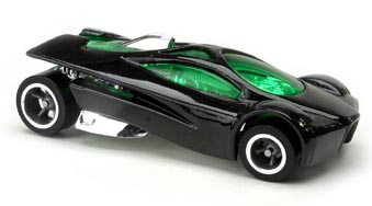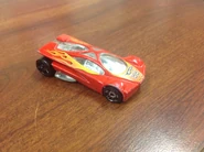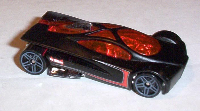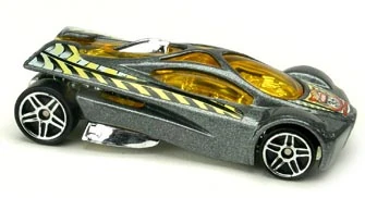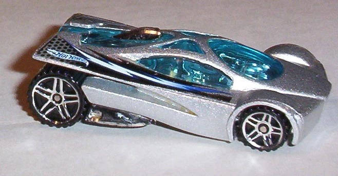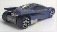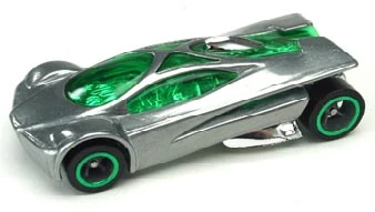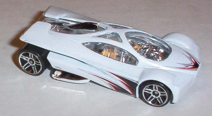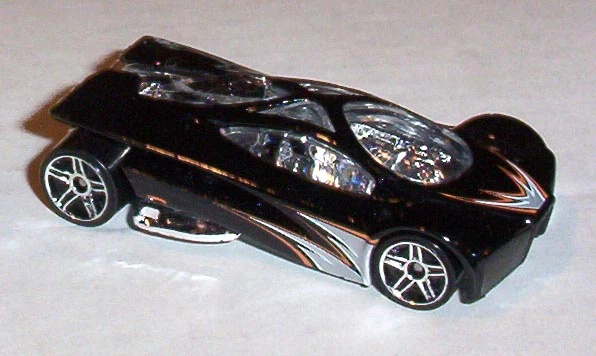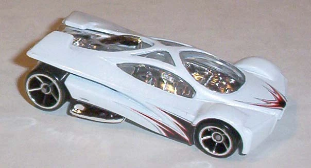 Sling Shot is a futuristic V12-powered supercar. The name allegedly comes from the tail's slight resemblance to a slingshot when seen in bird's-eye view. All Thailand made versions released before 2010 use a modified base tooling with wheel spacer tabs, accommodating skinnier rear wheels than the regular base. This casting was retooled in 2014 with a modified "connected" body, post-post rivets, a plastic base, and other small changes.