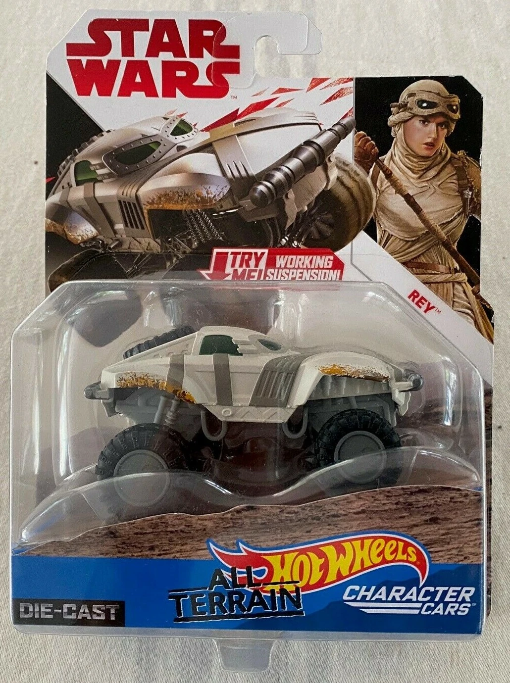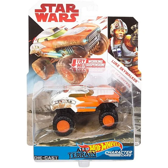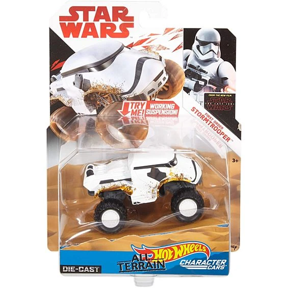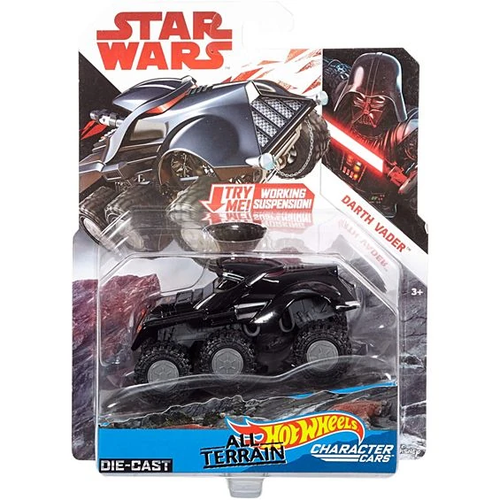 These iconic Star Wars character are comically recreated by Hot Wheels. They are 1:43-scale off-road caricatures of famous Star Wars characters. These souped-up cars are related to the regular Character Cars. They have working suspension. The All-Terrain Characters Cars were released in August 2017.