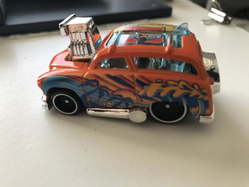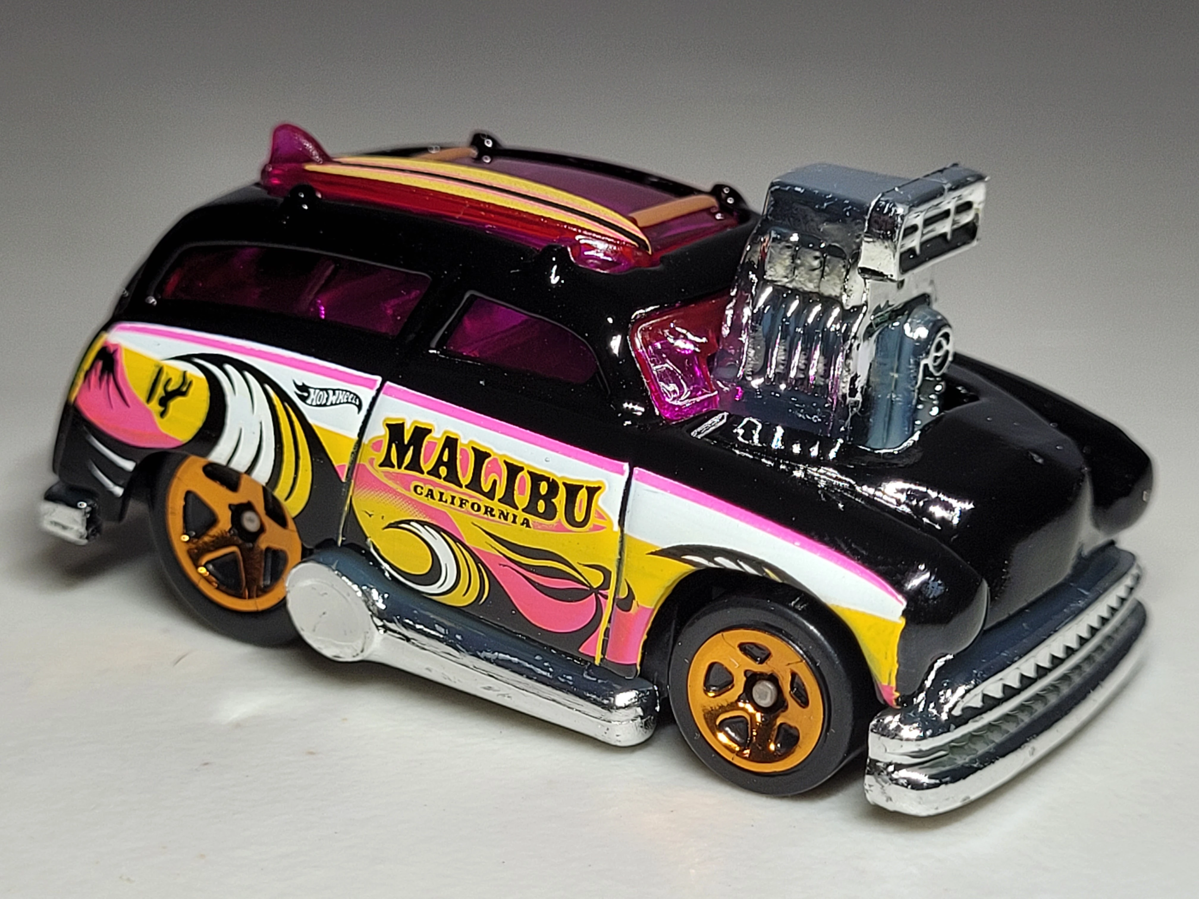 Orange | Sun, wave, HW logo on right. Wave, palm trees, sunset, and HW logo on the left. “E” and surfboard with “HW ART CARS” on roof. | Black / Plastic |