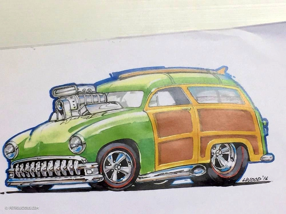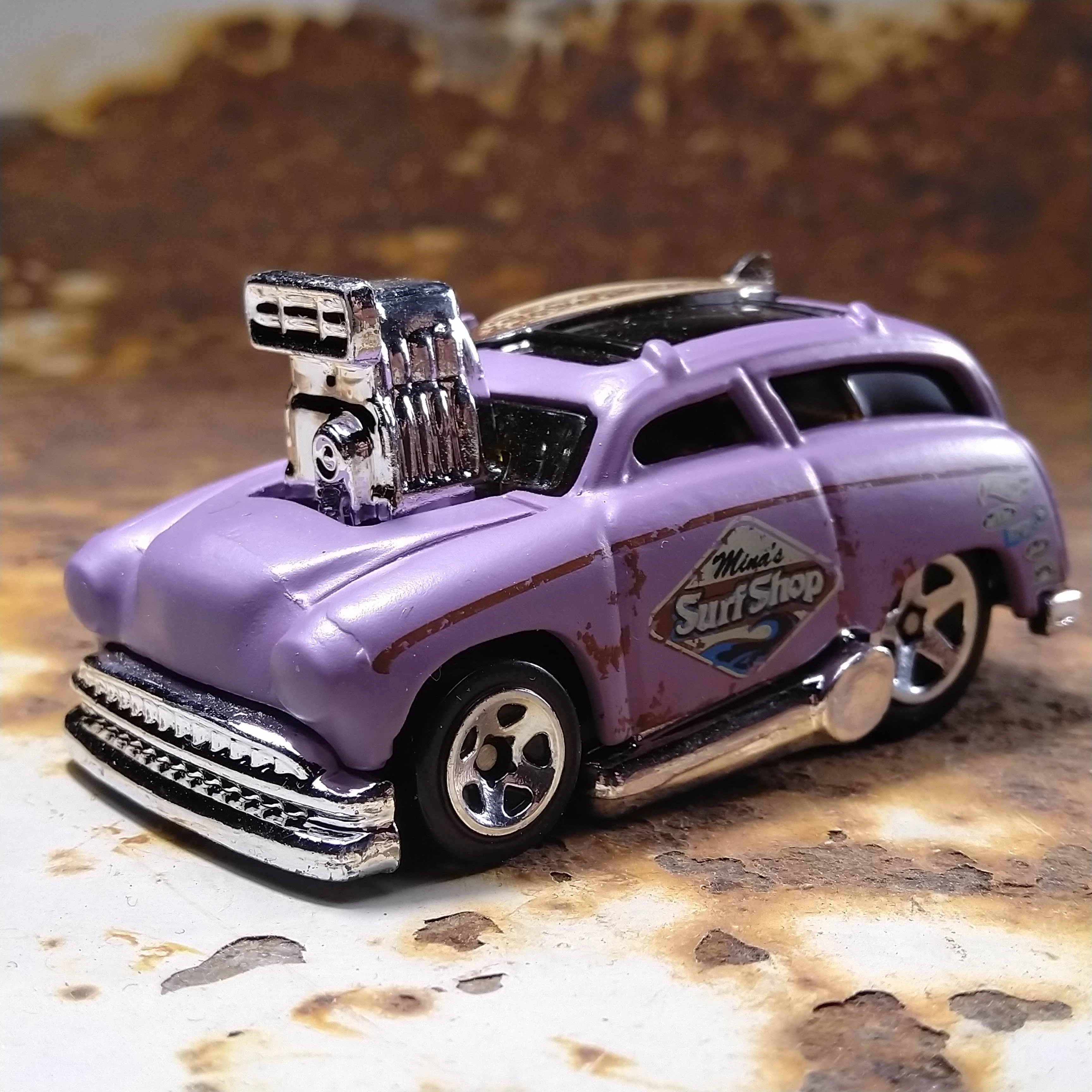 Surf 'N Turf is a Tooned-style woody wagon with a blown engine and sidepipes. A surfboard is attached to the sunroof up top, as well as a spare tire at the back. There is a ukulele on its backseat.