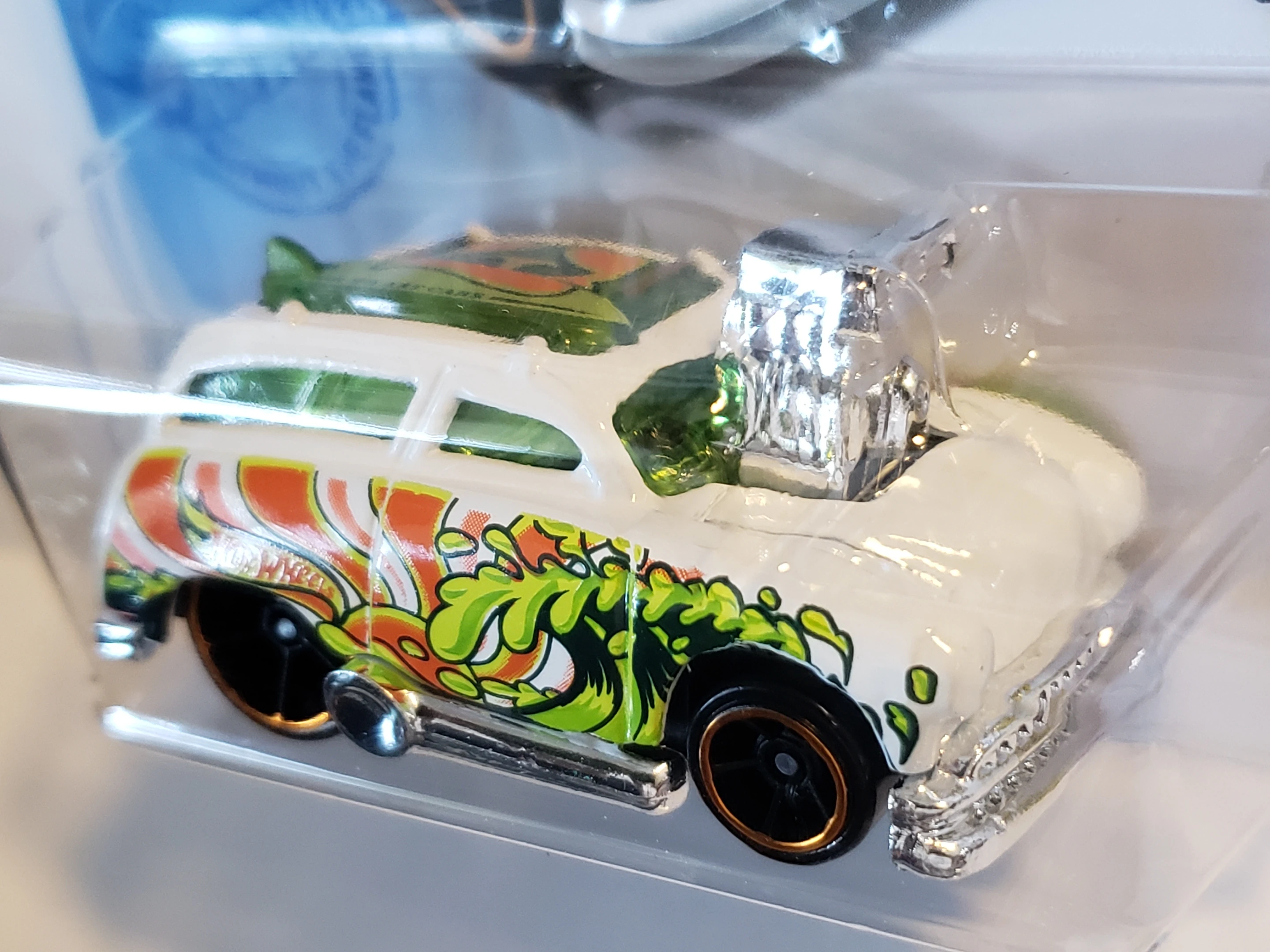 White | Orange sun, Green & black wave, Hot Wheels logo on right side. | Black / Plastic |
