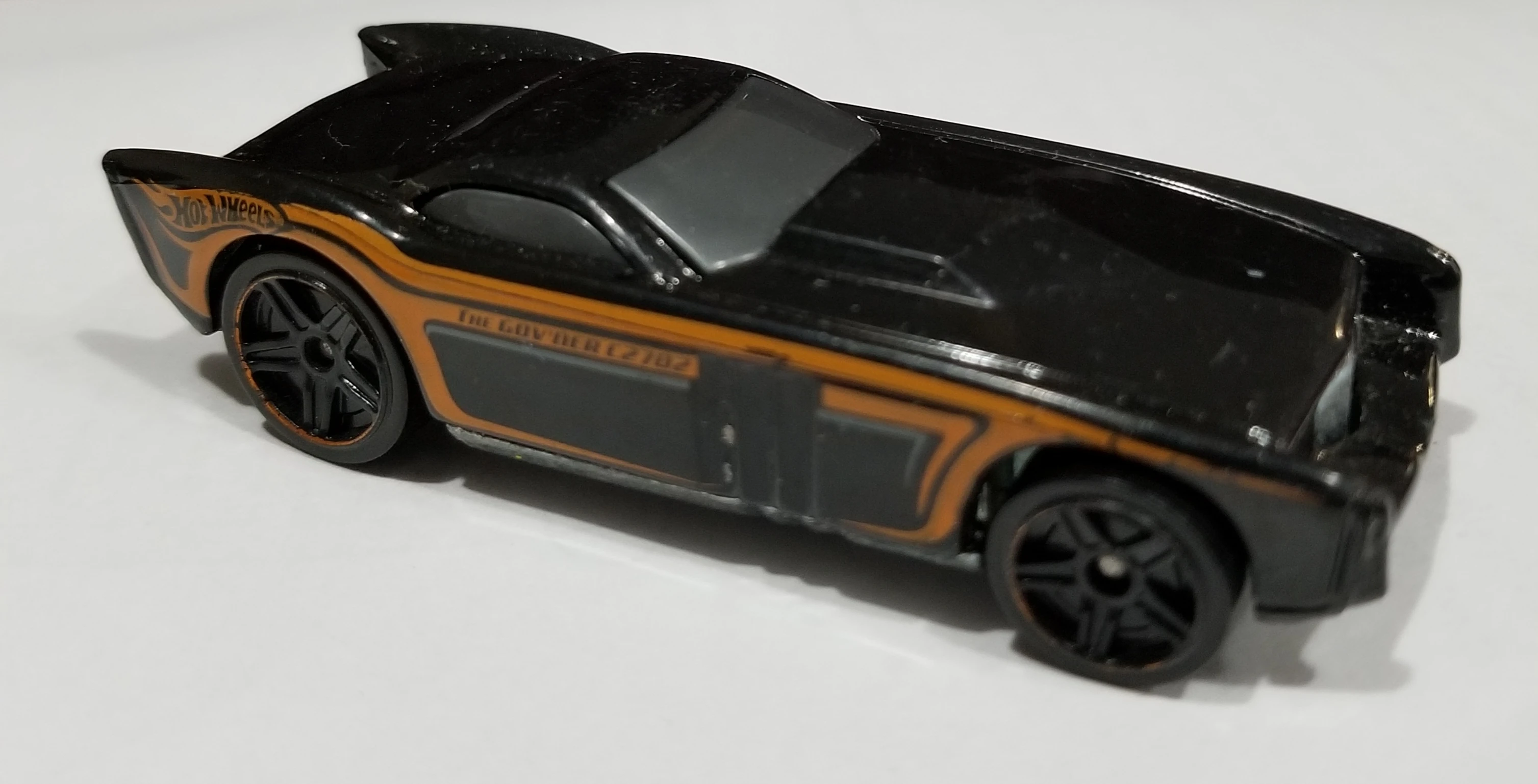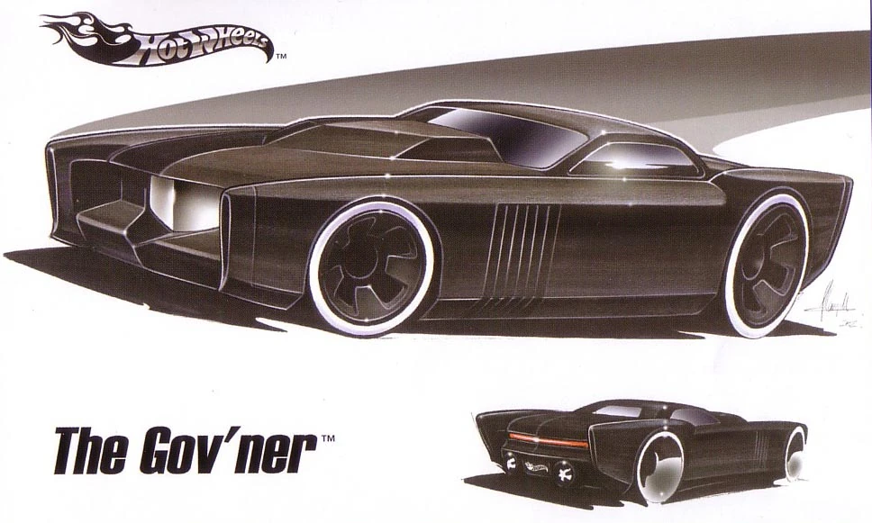 The Gov'ner is a slightly futuristic mafia-style muscle car. According to graphics designer MiQ Willmott, Fraser did not want any graphics (tampos) added to the casting for its 2004 First Editions release. Towards the end of the run however, a subtle broken gray line was added to the rear sides of the car. The 2004 Hot Wheels poster showed an asterisk next to this model's name, indicating "name subject to change" although it never was changed.