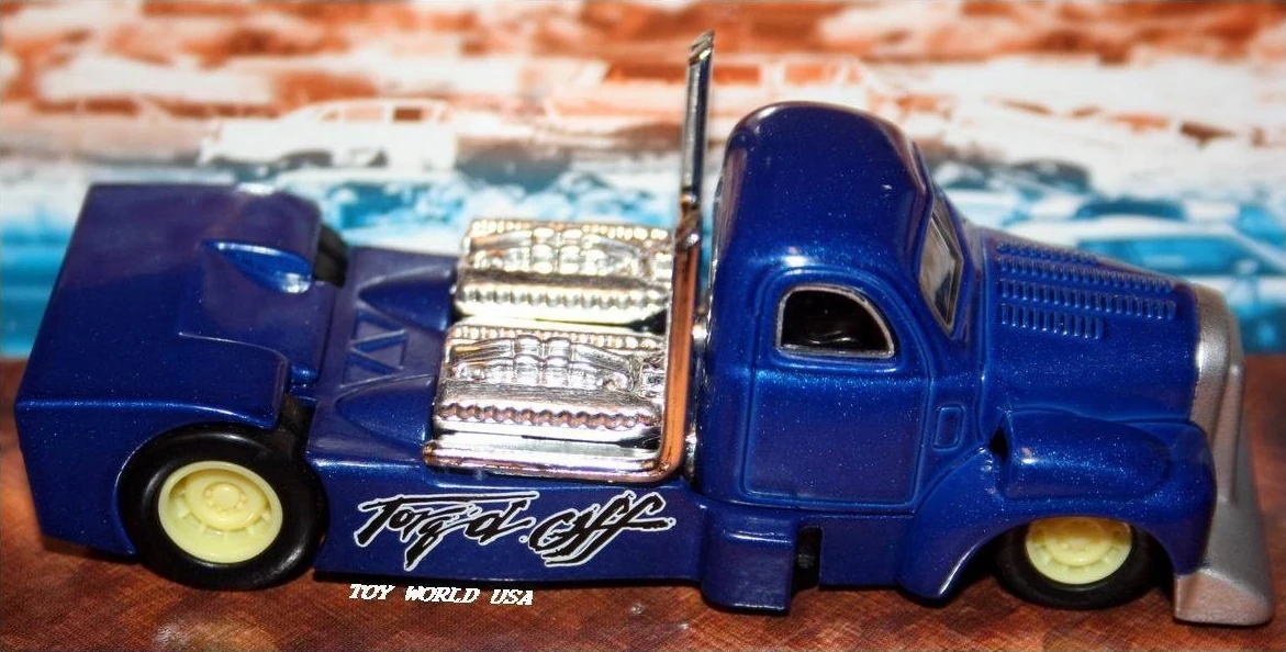The Torqued Off is a Hot Wheels casting designed by Bruce Baur which was only used once in the collector-aimed (100% Hot Wheels) Baur's Beasts 2-Car Set. Bruce's customized super semi-truck boasts two Allison aircraft engines, each of which would produce 3000 horsepower and torque that would go off the charts. Massive side scoops were designed to suck up air and help cool these hyper-hot twin-engines. This sure-to-be-fast beastie brings a new meaning to the term car-go!