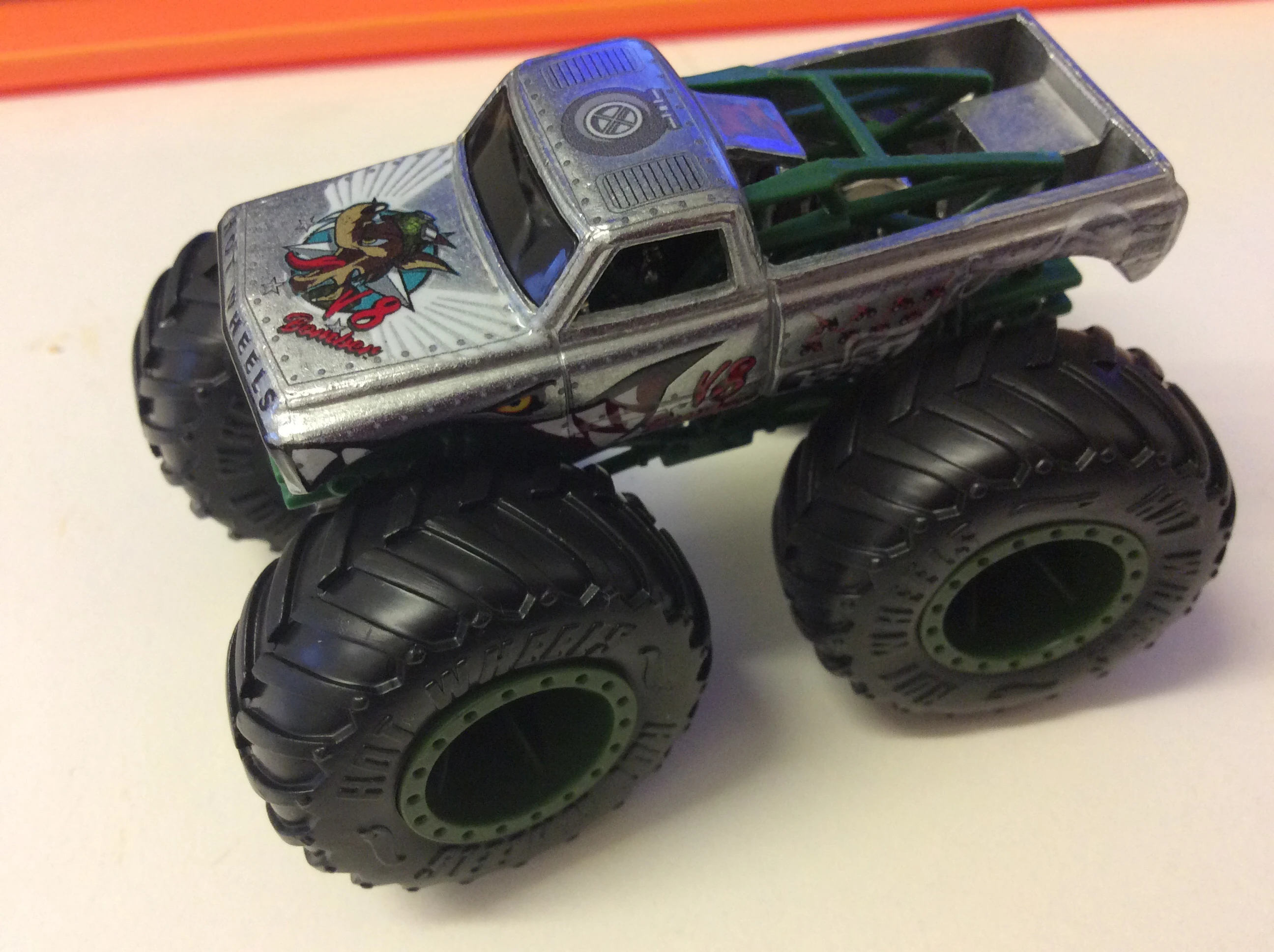 | 8/16 | 2018 | Hot Wheels Monster Trucks | Silver | Metal rivets on sides, hood & roof, teeth on front & sides, “V8 Bomber” on sides, coyote on hood, hatch & vents on roof. | Chrome Plastic | Tinted (Black) | Chrome | Dark Green MT | FYJ60 | Thailand | Base code(s): |