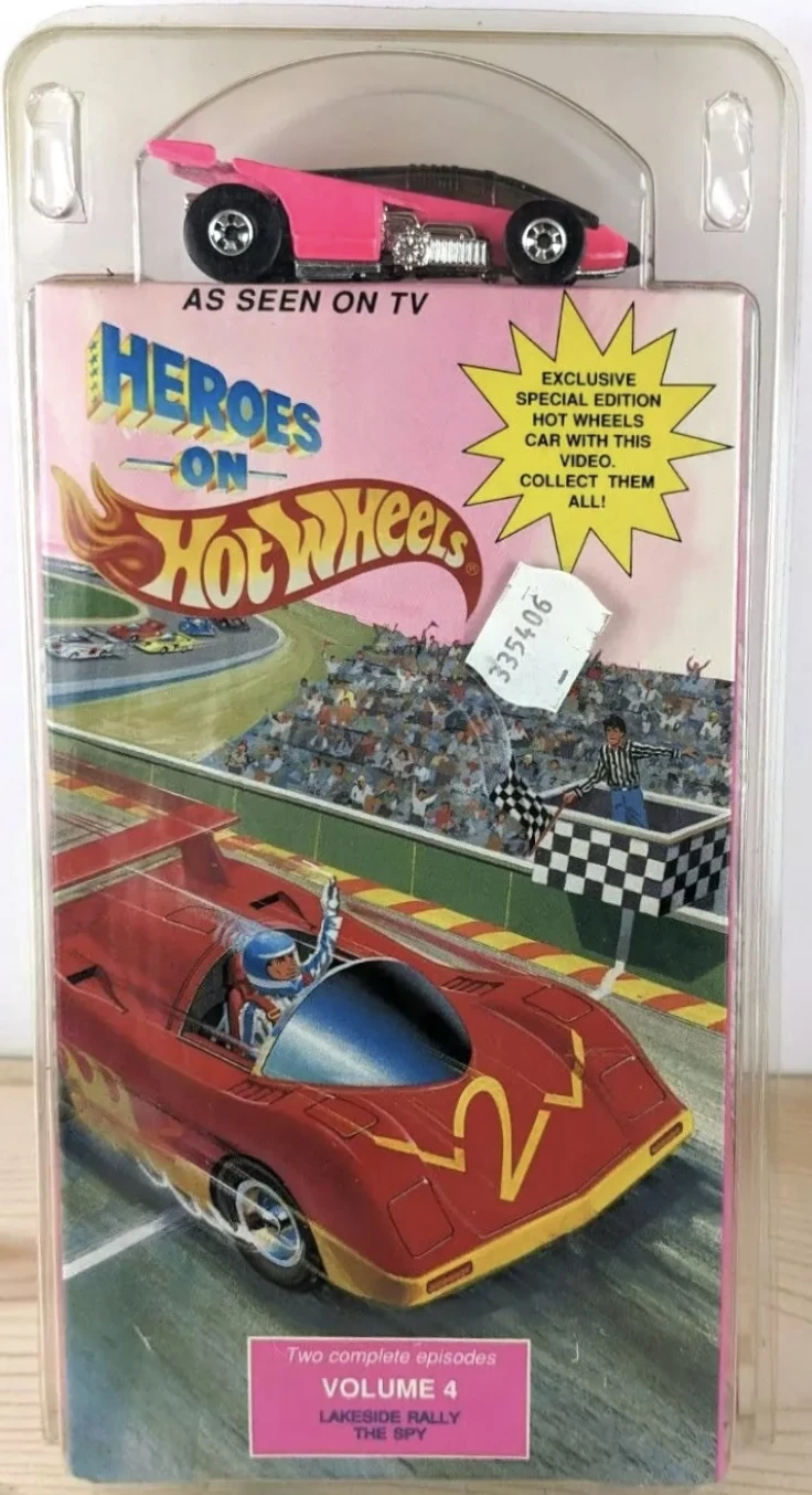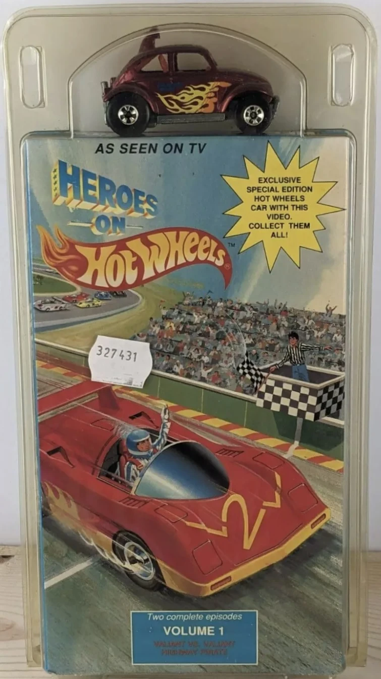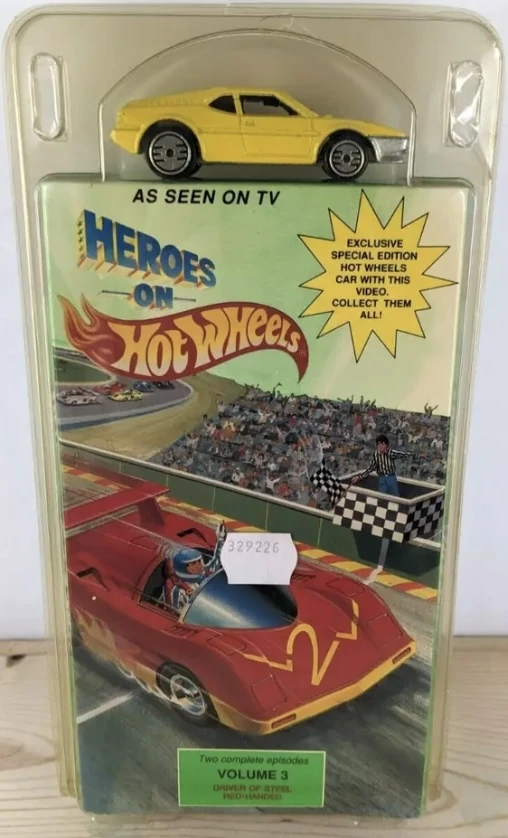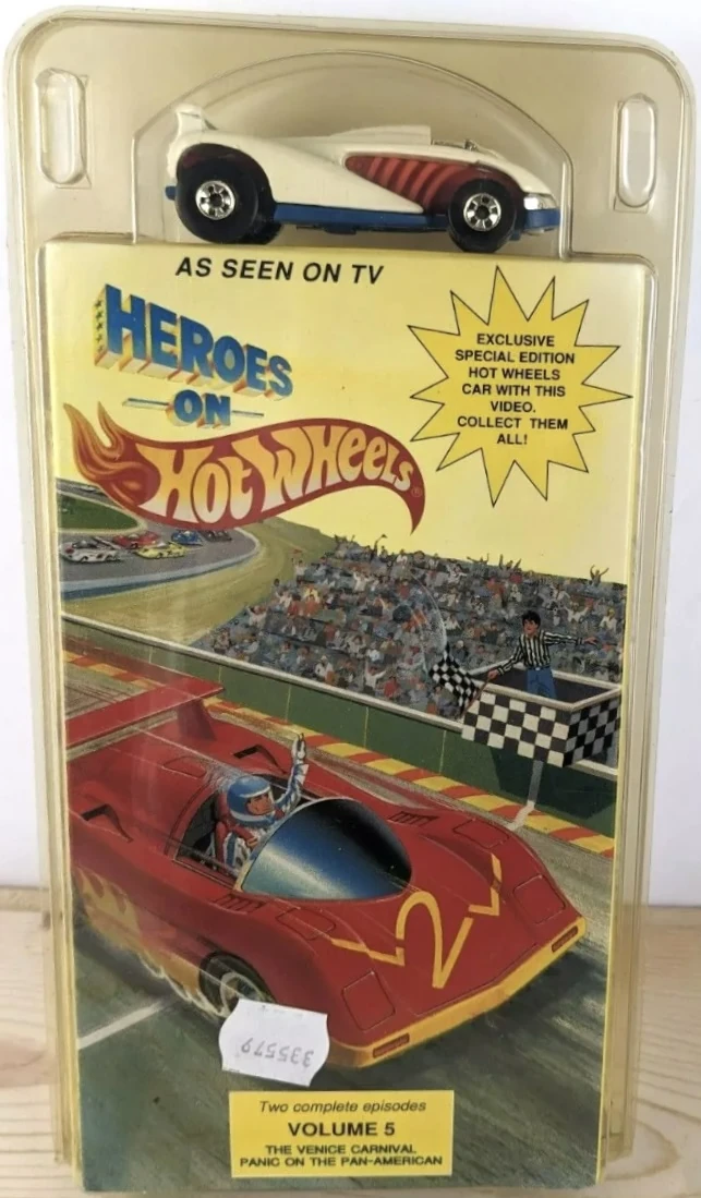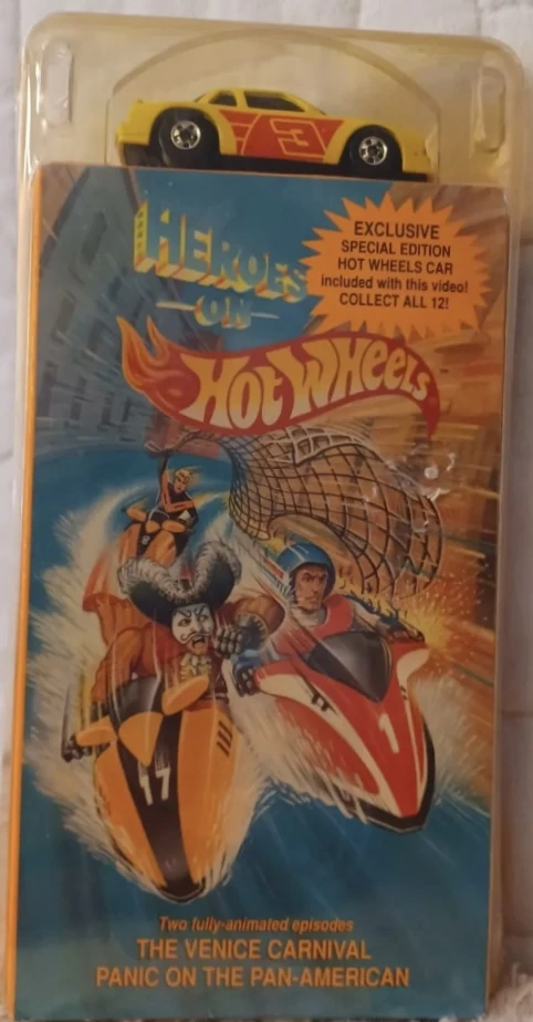 The VHS Pack debuted alongside the airing of the Heroes on Hot Wheels television series in 1991. It consisted of a single random model that loosely matched vehicles featured in the series, and one of six VHS tape volumes containing two episodes each. All artwork was modified later that year to feature a shot of the Sol-Aire CX4. A seventh VHS tape was released in 1993 through a McDonald's mail-in promotion that ran between 6 August 1993 to 31 December 1993.