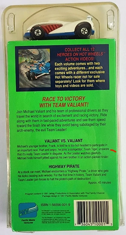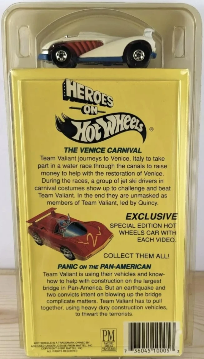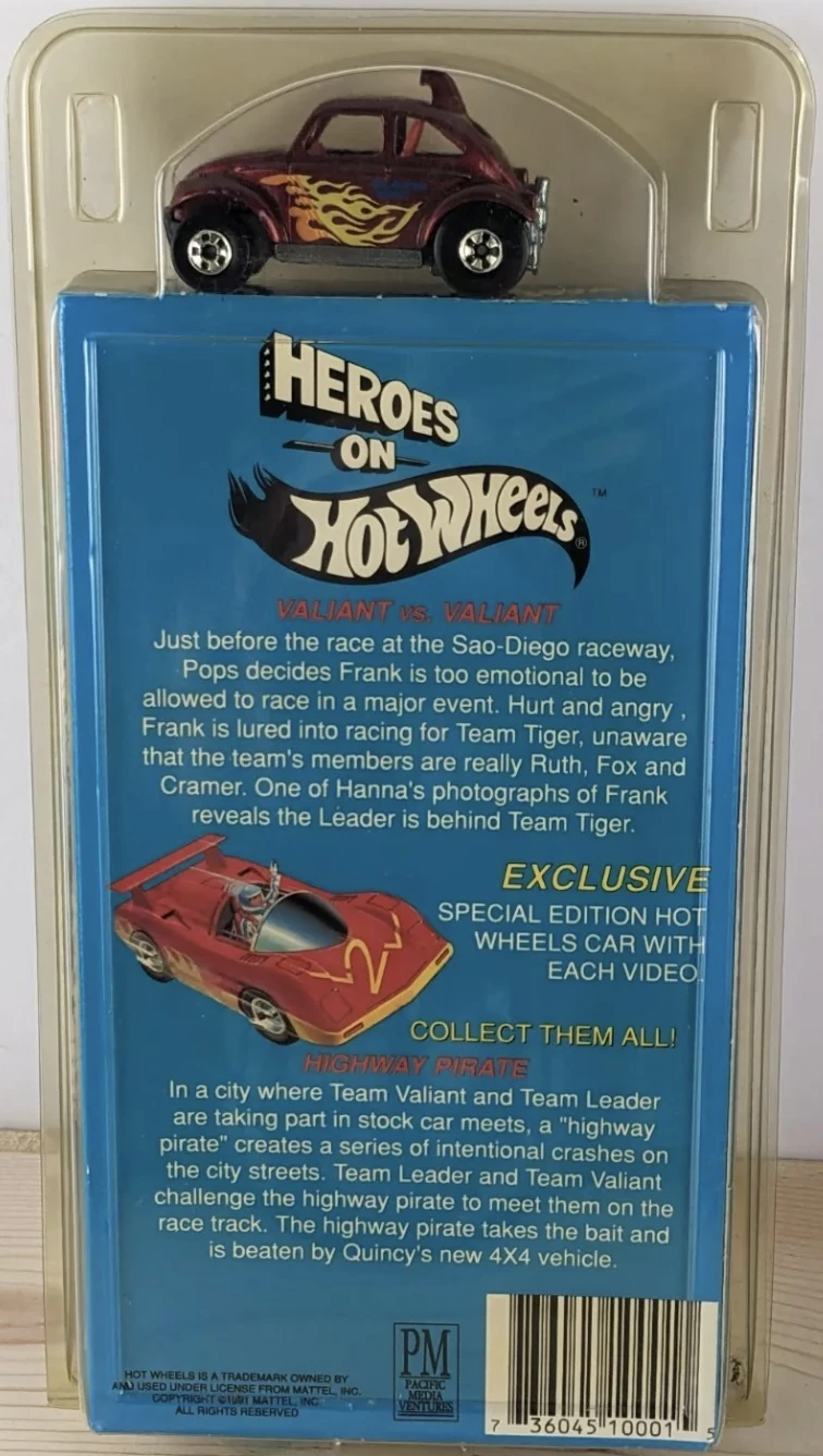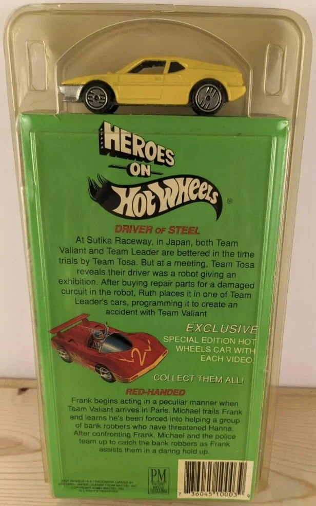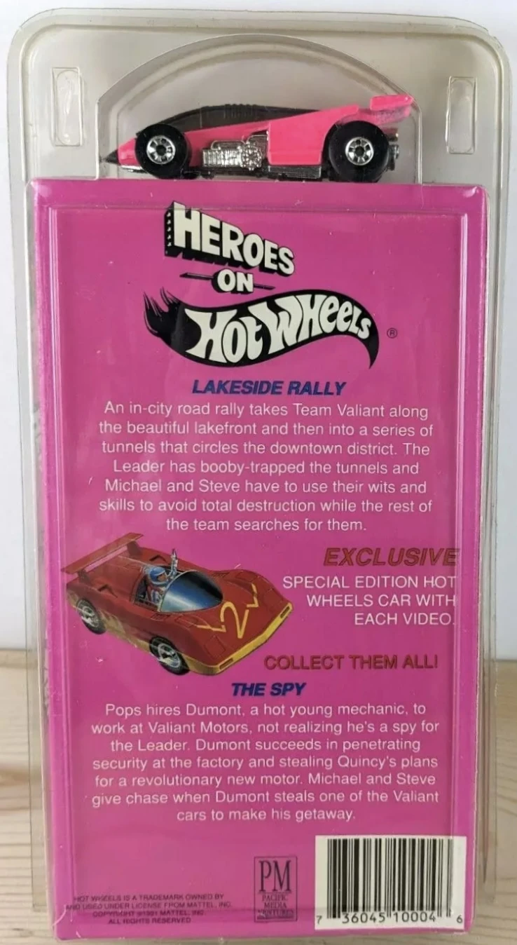 The VHS Pack debuted alongside the airing of the Heroes on Hot Wheels television series in 1991. It consisted of a single random model that loosely matched vehicles featured in the series, and one of six VHS tape volumes containing two episodes each. All artwork was modified later that year to feature a shot of the Sol-Aire CX4. A seventh VHS tape was released in 1993 through a McDonald's mail-in promotion that ran between 6 August 1993 to 31 December 1993.