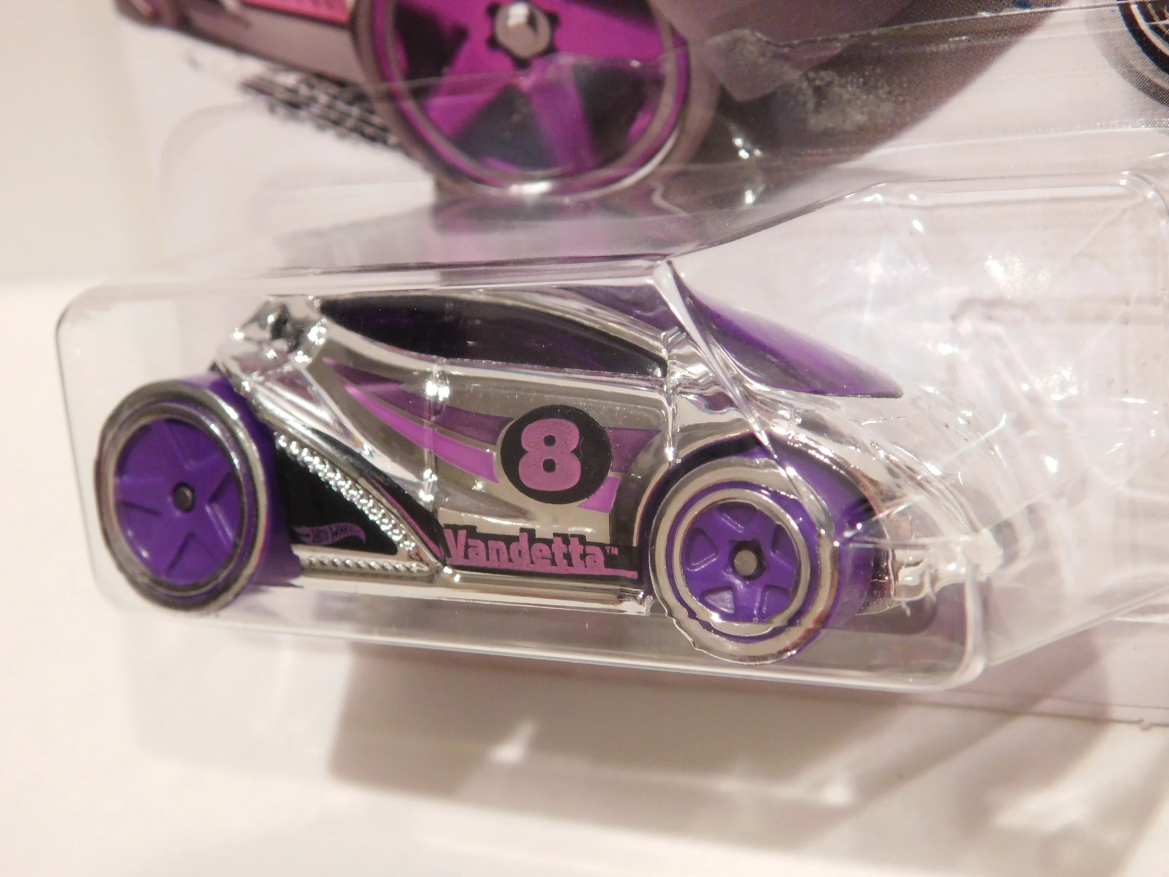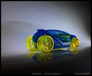 Vandetta is a highly futuristic hatchback-like race car with two V8 engines. It is a mixture of the words "van" and "vendetta". The tooling of the Vandetta was very slightly updated in 2016; the rear "slot" where the engine was inserted into was sealed with plastic to lower production costs.